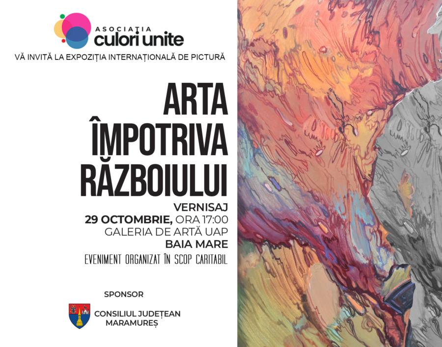Marți, 29 octombrie, ora 17.00, la Galeria de Artă UAP va avea loc expoziția internațională de pictură „Arta împotriva războiului”. Organizatorul acestui eveniment este Asociația „Culori Unite”, în parteneriat cu Consiliul Județean Maramureș. Evenimentul se vrea a fi un manifest artistic împotriva războiului din Ucraina, celebrând umanitatea și compasiunea. Maramureșul devine, astfel, un punct de întâlnire al empatiei și solidarității. Lucrările artiștilor din Ucraina, România, Danemarca, Croația, Republica Moldova și Polonia vor transmite prin intermediul culorilor și imaginilor un mesaj de non-violență și empatie, un indemn la reflecție asupra valorilor umane și culturale.