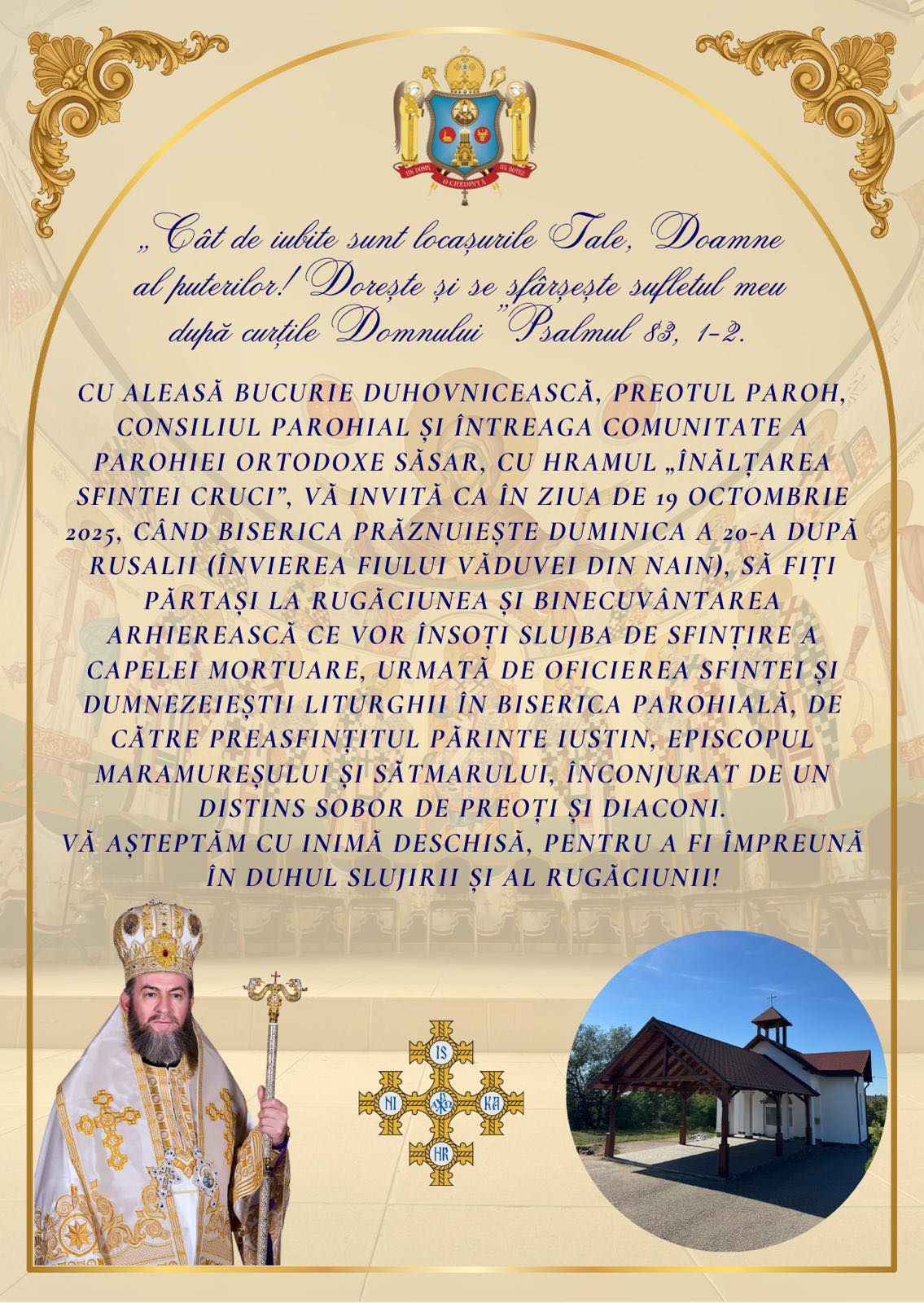 Vă așteptăm cu drag pe toți credincioșii satului și pe toți cei care doresc să fie părtași la această zi de rugăciune, lumină și binecuvântare arhierească.