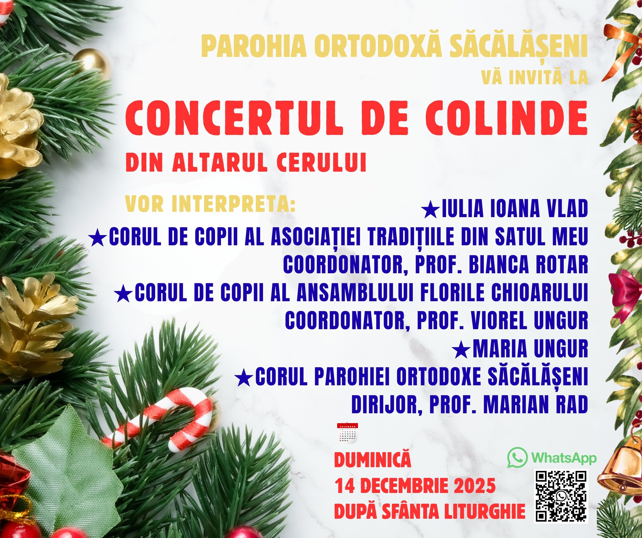 Cu binecuvântarea Preasfințitului Părinte Iustin, Episcopul Maramureșului și Sătmarului, Parohia Ortodoxă Săcălășeni organizează duminică, 14 decembrie, după Sfânta Liturghie, a IV-a ediție a Concertului tradițional de colinde „Din Altarul Cerului”.