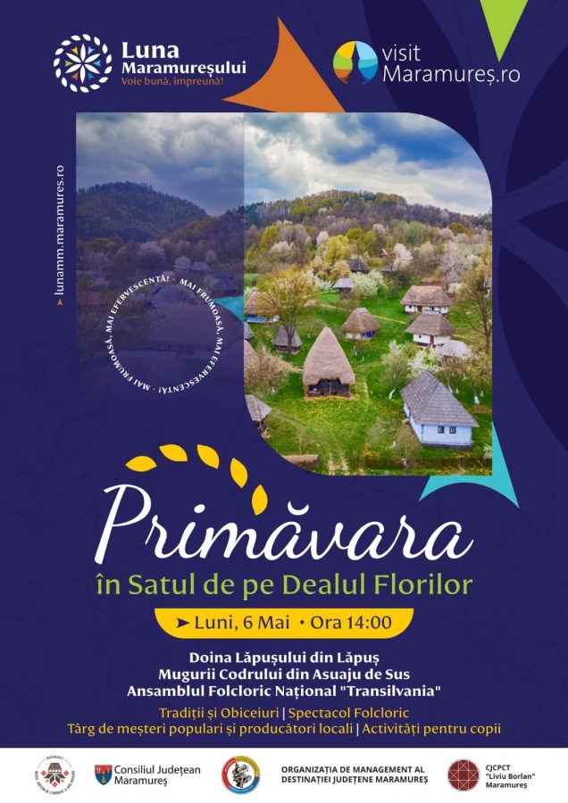 Consiliului Județean Maramureș alături de Organizația de Management al Destinației Județene Maramureș, în parteneriat cu Muzeul Județean de Etnografie și Artă Populară Maramureș, Ansamblul Folcloric Național „Transilvania” și Centrul Județean pentru Promovarea și Conservarea Culturii Tradiționale „Liviu Borlan” Maramureș organizează luni, 6 mai, evenimentul intitulat „PRIMĂVARA ÎN SATUL DE PE DEALUL FLORILOR”.