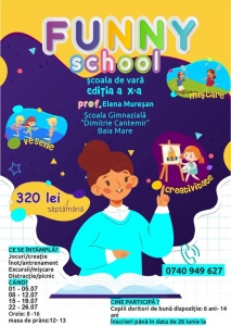 Școala de vară „Funny school” a ajuns la cea de-a -X-a ediție. Proiectul coordonat de prof. Elena Mureșan este organizat de Școala Gimnazială „Dimitrie Cantemir” Baia Mare. Pe perioada vacanței, elevii vor avea parte de activități educative și distractive: excursii, jocuri de creație, înot, picnic, antrenamente. Se pot înscrie copii cu vârstele între 6-14 ani, până la data de 26 iunie, la telefon 0740949627. Programul școlii de vară