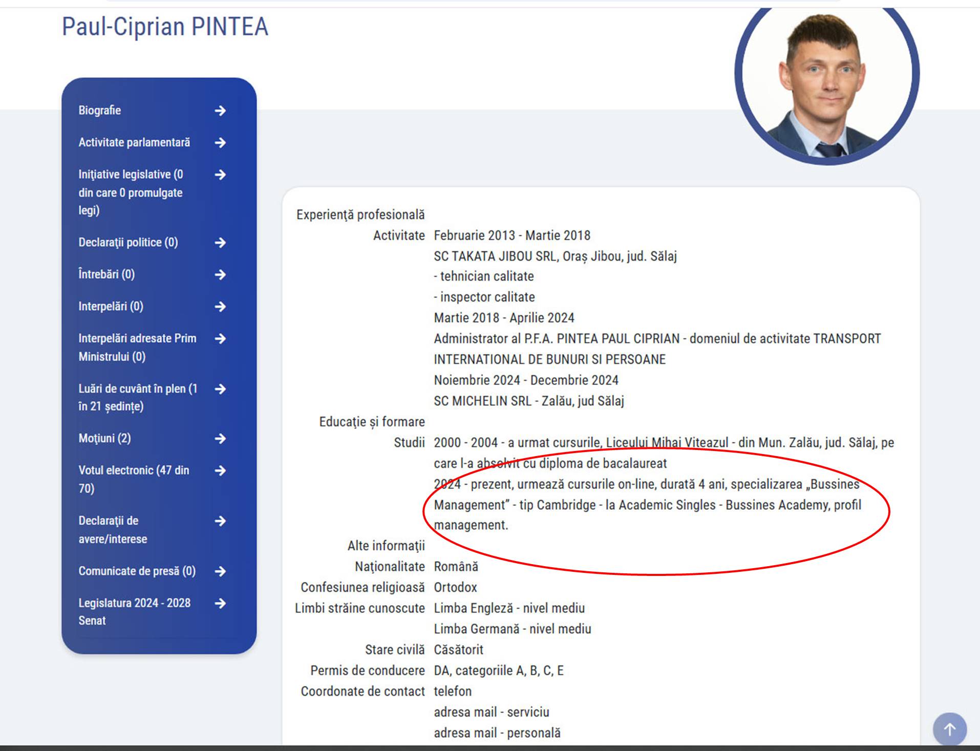 Mai departe, în secțiunea „studii”, senatorul nostru se laudă că urmează cursuri online la Business Academy și… Academic Singles. Ați citit bine! Doar că Academic Singles nu este o instituție de învățământ, ci un site de matrimoniale pentru „parteneri înalt educați”. Un detaliu care, fără îndoială, ridică noi standarde în educația alternativă, probabil extrem de utile în viața parlamentară.