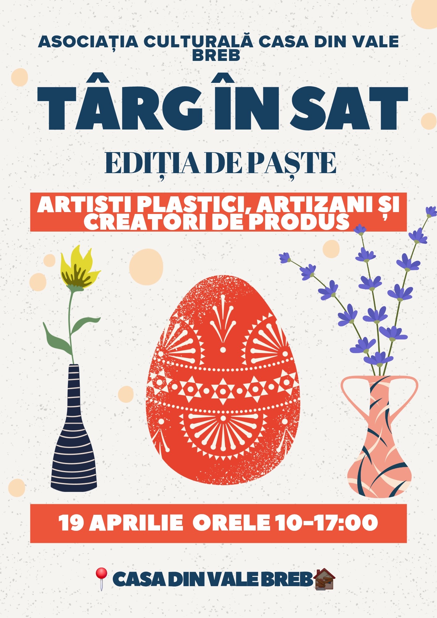 Sâmbătă, 19 aprilie, între orele 10.00 și 17.00, la Casa din Vale Breb se organizează o nouă ediție a Târgului în Sat – ediția de Paște.