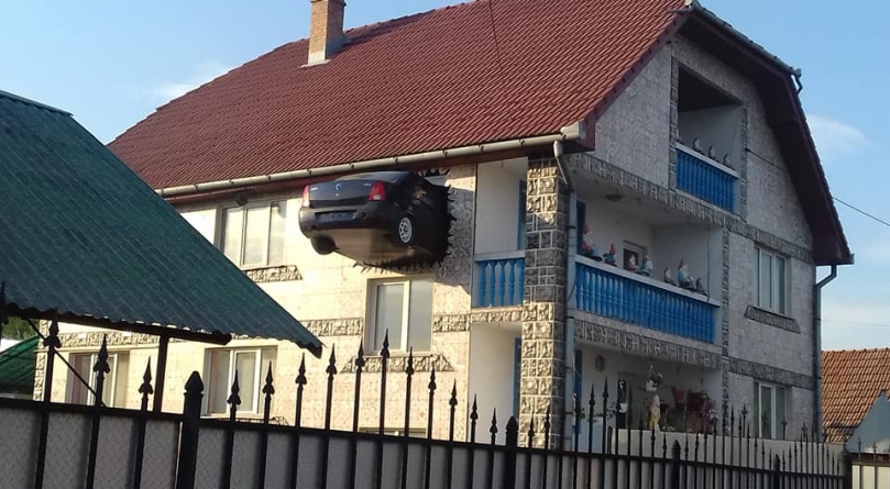 O casă din orașul Teiuș, județul Alba, are o decorațiune exterioară aparte. Proprietarul a avut ideea să-și amplaseze o jumătate de mașină la etajul doi în zidul locuinței, ca și cum automobilul i s-ar fi înfipt în casă. A primit autorizațiile necesare pentru a-și vedea pofta împlinită, așa că omul e în regulă cu actele. A durat mai bine de un an demersul, însă, după cum bine se vede, până la urmă răbdarea i-a fost răsplătită.