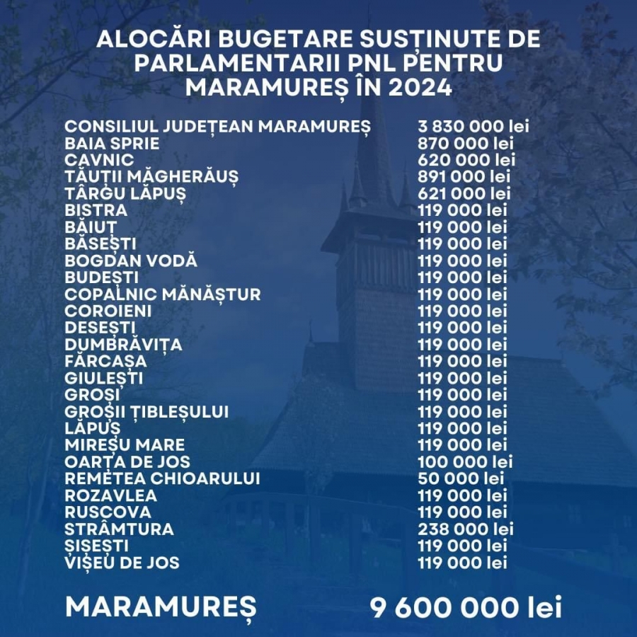 Prin eforturile făcute de parlamentarii PNL Maramureș, senatorul Cristian Niculescu Țâgârlaș, și deputații Călin Bota și Florin Alexe, Maramureșul este în top trei județe care primesc în 2024 alocare bugetară în plus, în baza amendamentelor depuse pentru susținerea proiectelor de dezvoltare și modernizare a județului.