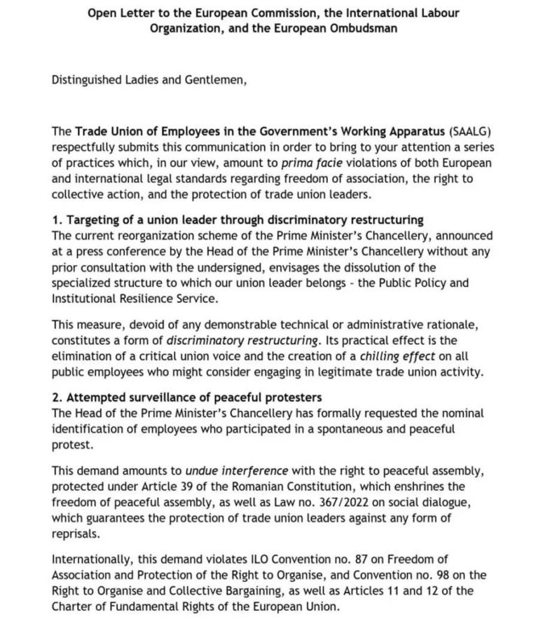 Sindicatul Angajaților din Aparatul de Lucru al Guvernului (SAALG) a transmis o scrisoare către Comisia Europeană, Organizația Internațională a Muncii și Ombudsmanul European, semnalând o serie de posibile abateri de la standardele privind libertatea sindicală și drepturile angajaților în cadrul Cancelariei Prim-ministrului.