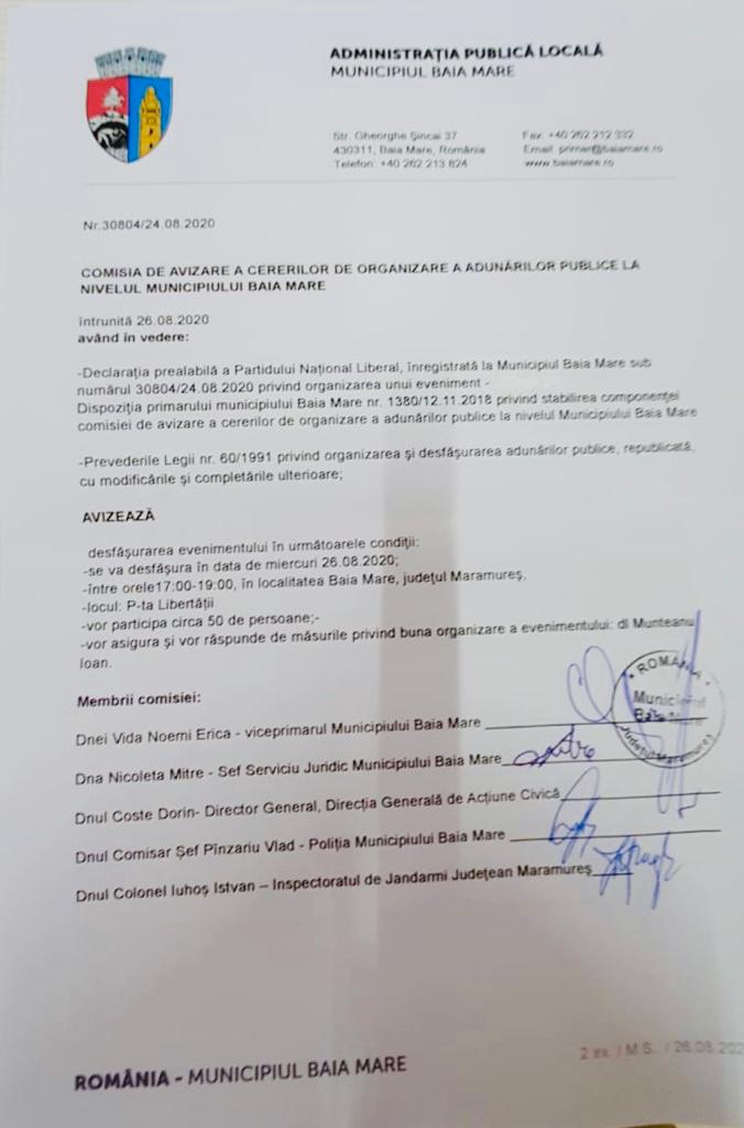 Partidul Național Liberal a respectat toți pașii legali pentru obținerea autorizației din partea autorității competente, pentru organizarea evenimentului din data de 26.08.2020 din Piața Libertății. Mai mult, PNL Maramureș a solicitat inițial o altă locație, pentru care nu a primit avizul necesar, iar pentru locația în cauză s-a primit autorizația din fotografie.