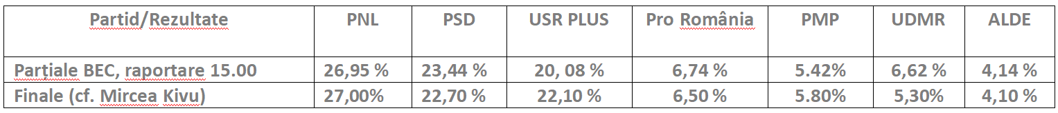 Biroul Electoral Central a comunicat rezultatele parțiale oficiale, înregistrate până la ora 14.30 și raportate la ora 15.00, următoarea raportare fiind anunțată pentru ora 17.00. Până când BEC va încheia numărătoarea, sociologul Mircea Kivu a anunțat pe pagina lui de socializare care sunt rezultatele finale ale alegerilor europarlamentare, incluzând și votul din diaspora. Desigur, nu poate fi vorba de niște rezultate oficiale, ci de o estimare rezultată din prelucrarea ponderată a datelor existente. După cum se observă, sociologul Kivu lucrează cu o singură zecimală, dar mizează pe corectitudinea ordinului de mărime. Iar din comparația cu datele reale – dar parțiale – de la BEC. Mircea Kivu ni iese deloc rău (vezi tabelul).