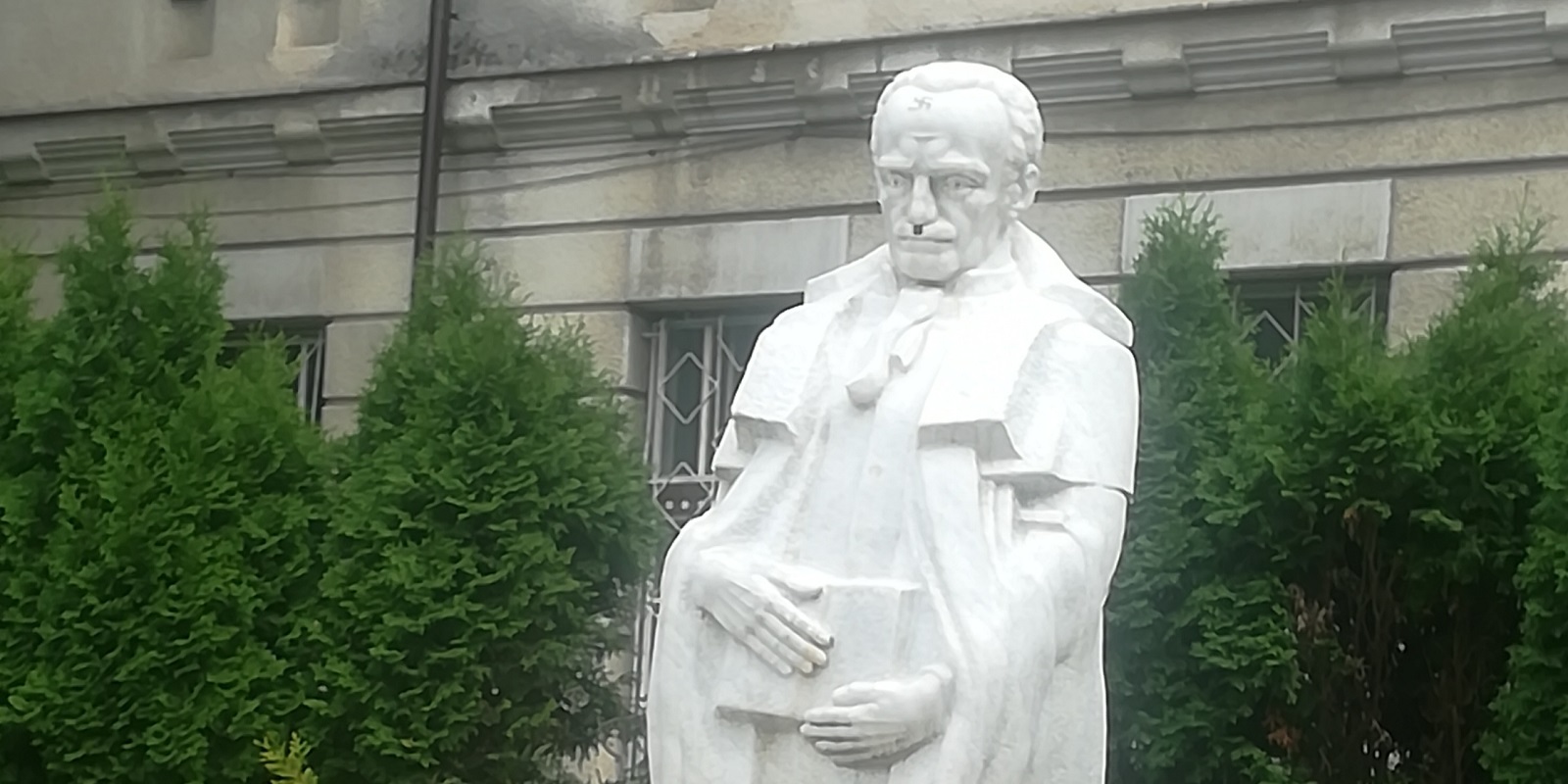 Lui Gheorghe Șincai, cel de pe soclul din fața colegiului care-i poartă numele, i-a răsărit mustață. Iar pe frunte o zvastică nazistă. Chiar dacă pentru aceste adăugiri pare să se fi folosit o carioca mai groasă, tot vandalizare se cheamă. Și dacă un idiot a făcut-o pe teribilul, altcineva nu a făcut nimic. Adică nu a intervenit nimeni dintre cei autorizați să șteargă urmele. Probabil se mizează pe o soluție naturală: să le înlăture ploaia. Ca o parafrază la cântecul Păsării Colibri: ”Ploaia care va veni/Le va curăța pe toate”… Adică și zvastica și mustața.