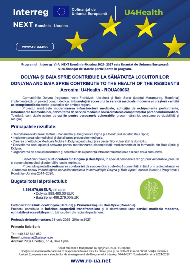 Proiectul, intitulat „DOLYNA și BAIA SPRIE contribuie la sănătatea locuitorilor” , este finanțat prin Programul Interreg VI-A NEXT România–Ucraina 2021–2027, cu o valoare totală de 1.396.679 euro, din care 898.400 euro pentru Dolyna și 498.279 euro pentru Baia Sprie. Implementarea se desfășoară între 21 iunie 2025 și 20 iunie 2027.