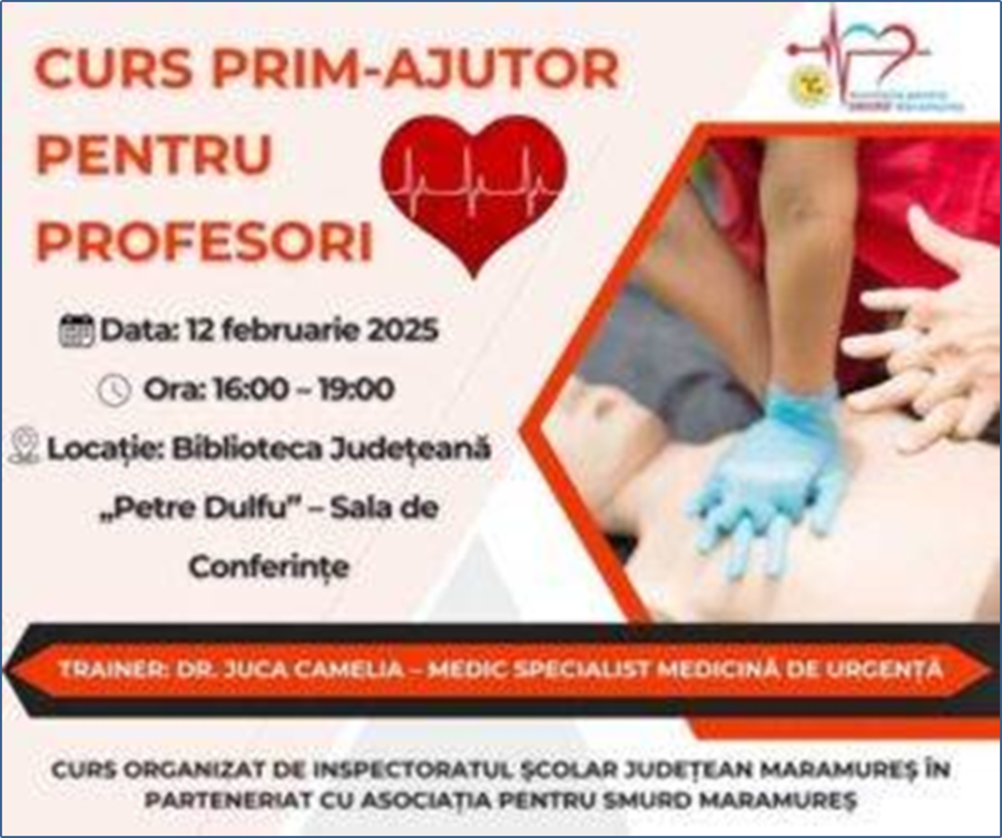 Asociația pentru SMURD Maramureș, în colaborare cu Inspectoratul Școlar Județean Maramureș, organizează o sesiune esențială de formare în acordarea primului ajutor destinată cadrelor didactice. Evenimentul va avea loc astăzi, 12 februarie 2025, începând cu ora 16:00, la Sala de Conferințe a Bibliotecii Județene „Petre Dulfu” din Baia Mare. Sesiunea, cu o durată de trei ore, va fi susținută de dr. Camelia Juca, medic specialist în medicină de urgență.