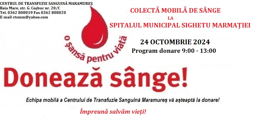 Acțiunea de donare de la Sighetu Marmației va avea loc joi, 24 octombrie, între orele 9:00 și 13:00, la Spitalul Municipal.