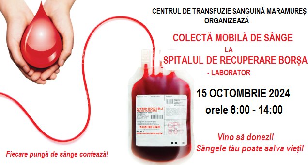 Centrul de Trasnfuzie Sanguină Maramureș anunță că se organizează colectă mobilă de sânge atât în Borșa, cât și în Sighetu Marmației.