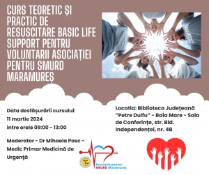 Luni, 11 martie 2024, între orele 09:00-13:00, Biblioteca Județeană „Petre Dulfu” Baia Mare, va fi gazda unui curs teoretic și practic de resuscitare „Basic Life Support.”Organizat de Asociația SMURD Maramureș, este destinat voluntarilor din cadrul acesteia