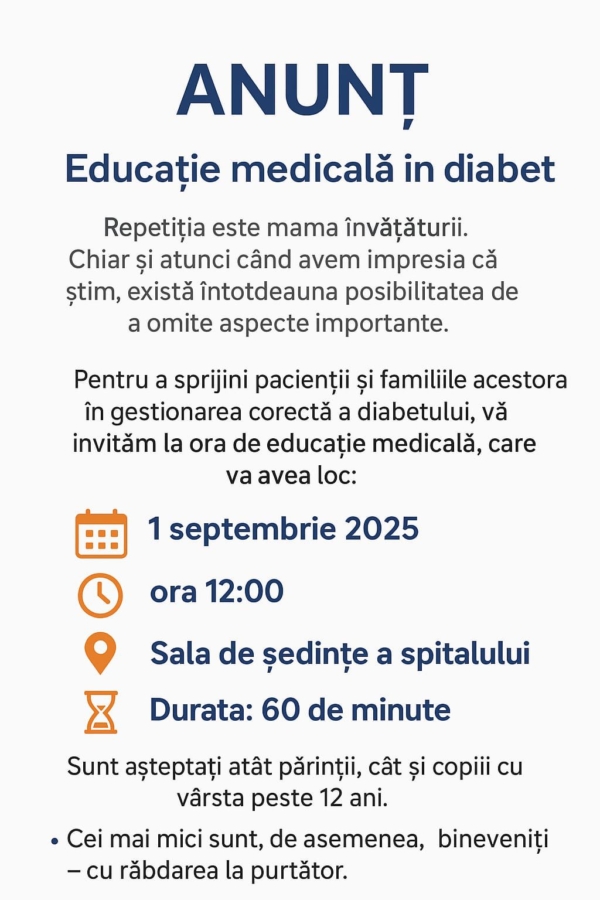 Evenimentul, cu o durată de 60 de minute, este dedicat pacienților, familiilor acestora și copiilor peste 12 ani, dar și celor mai mici, însoțiți de părinți. Participanții vor primi informații esențiale despre gestionarea corectă a diabetului și vor fi încurajați să adopte obiceiuri care pot îmbunătăți calitatea vieții.