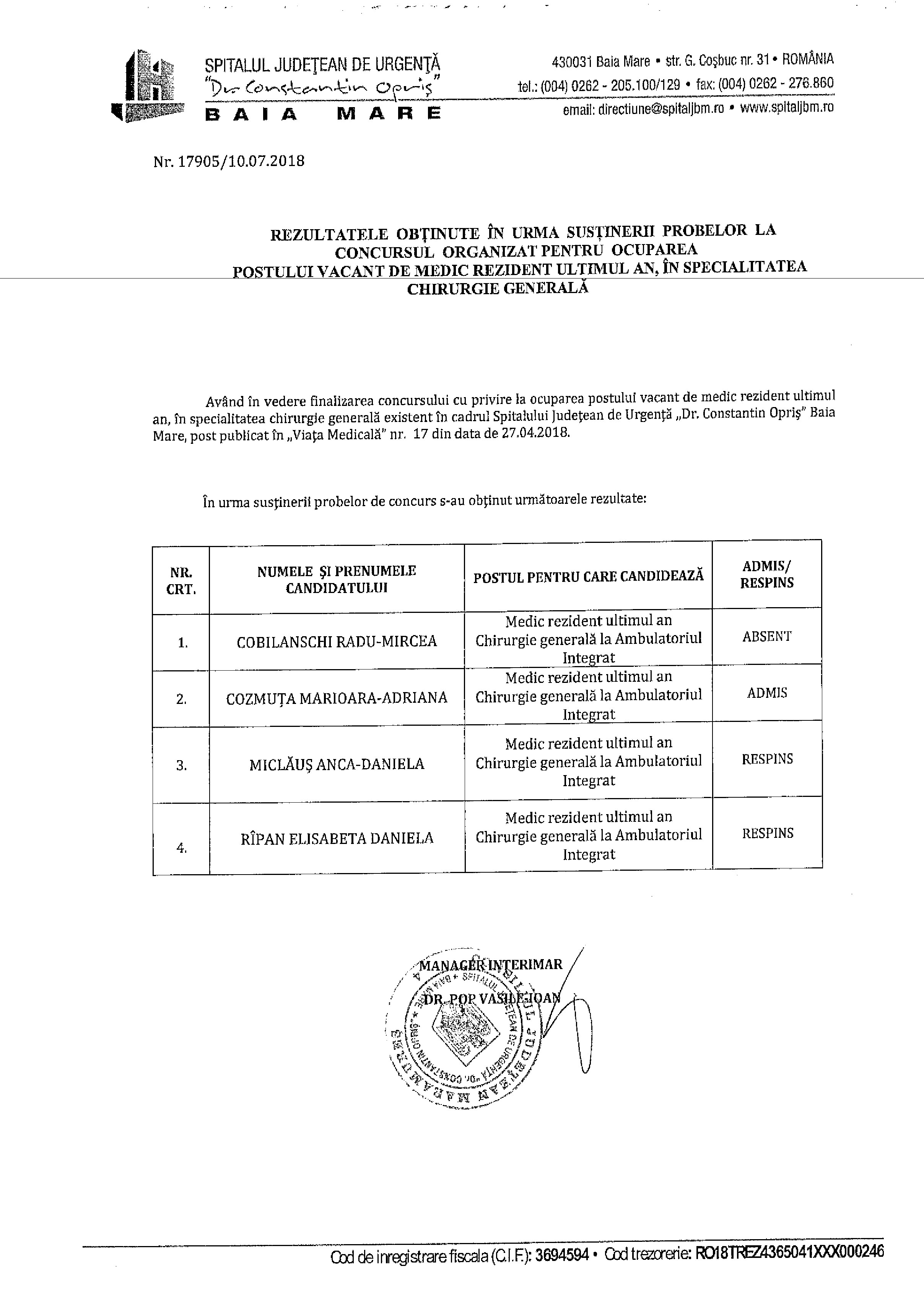 Echipei băimărene de chirurgi i se va alătura un nou medic. Acesta va lucra în Ambulatoriul Integrat al Spitalului Județean de Urgență ”Dr. Constantin Opriș” Baia Mare. Marioara-Adriana Cozmuța a fost admisă la concursul pentru ocuparea postului vacant de medic rezident- ultimul an, specializarea chirurgie generală, publicat în luna aprilie, în revista ”Viața Medicală”. La concurs s-au înscris patru candidați, unul a absentat de la examen, iar doi au fost respinși, potrivit datelor comunicate de Spitalului Județean de Urgență ”Dr. Constantin Opriș” Baia Mare.