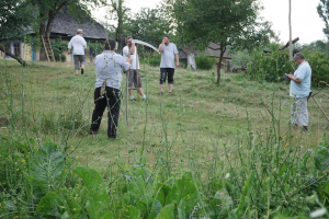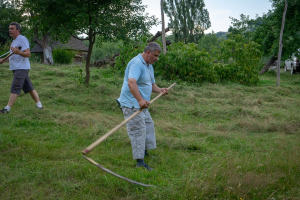 Am fugit în şură, casă, găbănaş. O plouat bugăt de mult, şi-ntr-o vreme ne-am regrupat în casă la un blid de guiaş bun. Şi pe când mâncam noi mai cu poftă, s-o oprit ploaia. Şi iară ne-o cuprins ruşinea de guiaşul şi plăcintele cele bune şi de iarba ce multă de-afară. Şi tocmai pe vremea când Brazilia primea al doilea gol, ne-am apropiat din nou de iarbă. Am mai cosât până aproape de doi la unu – pentru Belgique – , cât să-i facem lui Ştefan drum prin iarbă cătă pădure. Bogdan i-o cosât şi nişte morcovi din grădină, să nu se ude la picioare când a mere după ptitoi. Cam atâta am putut face. Ştefan ne-o laudat. Ne-o dat de mâncare şi de băut. Nouă ni-i cam ruşine, drept să spunem, că nu tare mult am cosât. Amu, Ştefan, ne iartă! Şi mai fă o clacă numai cu scrijele de ptită cu unsoare şi-om bdirui şi iarba ce-o rămas. Că suntem datori pentru toate bucatele ce le-ai pus pe masă şi pentru pregătirile doamnei Ani şi a celorlalte doamne ce au ajutat.