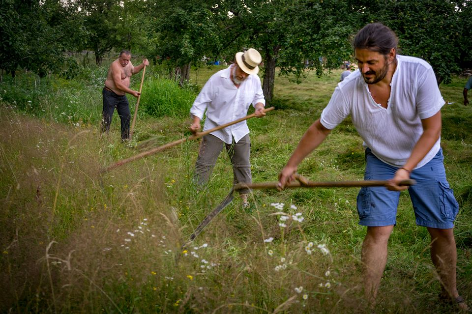 Am fugit în şură, casă, găbănaş. O plouat bugăt de mult, şi-ntr-o vreme ne-am regrupat în casă la un blid de guiaş bun. Şi pe când mâncam noi mai cu poftă, s-o oprit ploaia. Şi iară ne-o cuprins ruşinea de guiaşul şi plăcintele cele bune şi de iarba ce multă de-afară. Şi tocmai pe vremea când Brazilia primea al doilea gol, ne-am apropiat din nou de iarbă. Am mai cosât până aproape de doi la unu – pentru Belgique – , cât să-i facem lui Ştefan drum prin iarbă cătă pădure. Bogdan i-o cosât şi nişte morcovi din grădină, să nu se ude la picioare când a mere după ptitoi. Cam atâta am putut face. Ştefan ne-o laudat. Ne-o dat de mâncare şi de băut. Nouă ni-i cam ruşine, drept să spunem, că nu tare mult am cosât. Amu, Ştefan, ne iartă! Şi mai fă o clacă numai cu scrijele de ptită cu unsoare şi-om bdirui şi iarba ce-o rămas. Că suntem datori pentru toate bucatele ce le-ai pus pe masă şi pentru pregătirile doamnei Ani şi a celorlalte doamne ce au ajutat.