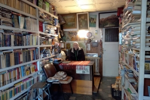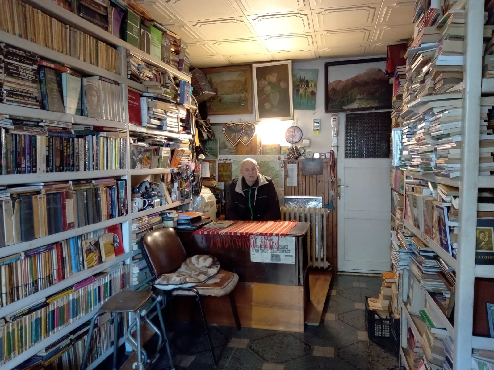 Pe vremuri, când am început, greu făceam rost de cărți. Atunci lumea mai ținea la carte. Mi-am desființat eu biblioteca, iar pe urmă mi-am recuperat-o. Pentru că trebuia să încep cumva. Iar apoi, încet, încet s-au tot adunat. Uneori mai fac câte-o „curățenie”, sunt nevoit să le pun la container. Efectiv sunt nevoit, cu rupere de inimă, pentru că fiecare carte conține ceva interesant. Spațiul e destul de restrâns aici. Trebuia să fie garaj, dar l-am transformat în anticariat.