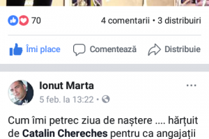 O tradiție a paginii facebook a CS Minaur constă în postarea de urări cu ocazia zilei de naștere a unui sportiv sau membru al stafului tehnic. La începutul săptămânii trecute, pagina facebook a CS Minaur a postat o urare pentru ziua de naștere a directorului executiv, Ionuț Marta (e un obicei marcarea unor astfel de sărbătoriri din viața sportivilor sau celor din staful tehnic). Cătălin Cherecheș, aflat în concediu în străinătate, a cerut înlăturarea, în primă fază doar a pozei sărbătoritului, iar mai apoi a întregii postări. La un moment dat, a dispărut întreaga pagină de facebook. Primarul Cătălin Cherecheș și-a justificat această solicitare: ”Am cerut respectarea regulii conform căreia orice comunicare către exterior trebuie avizată de cei de la comunicare” ● ”Bine, dar nu Ionuț Marta și-a făcut o auto-urare și o auto-postare!” ● ”Mai e o chestiune deontologică și de consecvență. Nu la fiecare jucător/jucătoare ori angajat s-au făcut astfel de postări. Și vă dau un singur exemplu: niciun anunț de ziua de naștere a antrenorului Băban, o personalitate de anvergură a handbalului românesc, nu un angajat contractual ca Marta”. Ceva mai târziu, primarul a cerut departamentului de resurse umane al Primăriei un control inopinat la sediul clubului pentru a verifica prezența. Și ca să nu pară ceva țintit, un comunicat oficial precizează că vor fi verificări ”la Executivul Primăriei, Serviciul Public de Asistență Socială, Serviciul Public Ambient Urban, la Clubul Sportiv Minaur Baia Mare și Poliția Locală”. Considerându-l neregulamentar, Marta a ignorat controlul și a postat pe pagina lui de facebook un mesaj în care scrie că e hărțuit de Cătălin Cherecheș, chiar de ziua lui. În comunicatul oficial, atitudinea directorului Ionuț Marta e doar sugerată de o exprimare făcută într-o impecabilă limbă de lemn comunistoidă: ”Regretăm faptul că această acțiune a fost sabotată de către unii angajați contractuali în funcții de conducere și care au avut un comportament abuziv la adresa doamnelor care au fost desemnate în a efectua acest demers legal (verificarea prezenței angajaților)”. Acest aspect a fost augmentat și de primar: ”Și-a permis (Marta- n.n) să se adreseze jignitor și deplasat doamnelor pe care le-am trimis acolo și să le rupă hârtiile”