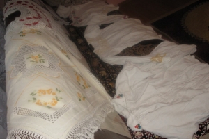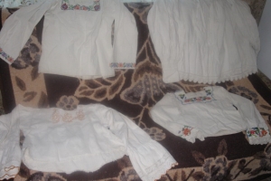 În timp ce-mi povestește, deschide dulapul și le scoate pe pat, le aranjează și le pune pe categorii: „Astea sunt foarte vechi și lucrate foarte mărunt. Uitați-vă ce dantelă deasă și măruntă au la mânecă. Am avut expus spăcelul de mireasă al mamei. Îmi place să vadă lumea cum se lucra mai demult, cât erau de migăloase, de frumoase… Am adunat cămăși de la oamenii din sat, ca să le expun…Am scormonit în lada de zestre…Vedeți, cămașa asta bărbătească are peste o sută de ani.”