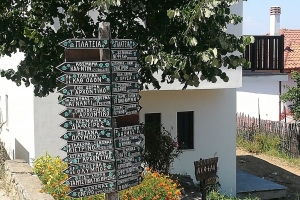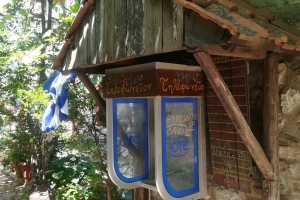 Oprim, coborâm, respirăm şi ne aruncăm privirea dincolo de parapetul de piatră care anunţă intrarea în sat. Într-un abur albastru se văd de sus, golful, marea, lanţul de staţiuni de pe riviera Olimpului, cetatea Platamonas. Iar în apropiere, muntele, pădurea şi nişte acoperişuri din ţiglă roşie, etajate, terasate, precum nişte umbrele cu o geometrie perfectă, încadrate de multă verdeaţă. Dăm de prima intersecţie pavată cu piatră, care mă face să mă pregătesc pentru o incursiune într-o poveste; amplasat într-un strat cu crăiţe… panoul cu indicatoarele străzilor, scrise de mână pe plăcuţe din lemn, apoi prima cabină telefonică, apărută unde nu te-aştepţi, agăţată de-un perete de piatră, protejată de un acoperiş cu ţiglă cu muşchi şi licheni, şi-apoi coborârea spre centru, unde dai de primul magazin, unde lumea se înghesuie să deguste şi să cumpere tsipouro – băutura făcută de localnici, un fel de ţuică tare şi aromată.