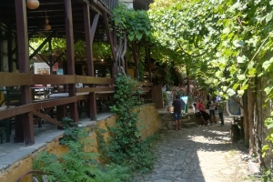 Casele din piatră şi lemn par că pornesc una din alta, doar cu mici pauze de flori între ele. Totul e din piatră, totul pare lucrat manual: de la străzi şi indicatoare, la meniurile majorităţii tavernelor unde se mănâncă tradiţional şi bine. Magazinele sunt mai degrabă nişte cămări de gospodine, cu şerveţele brodate şi mileuri din dantelă manuală, puse sub borcanele de miere de castan, şerbeturi, dulceţuri şi băuturi. Valurile de turişti care năvălesc pe străduţele mici-mici, boltite de viţă de vie, iederă, pipa turcului, rodie şi rododendron mă trimit cu gândul la laptele care dă-n clocot. Atât de mulţi sunt.