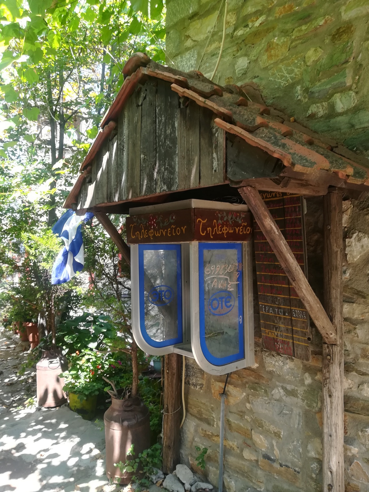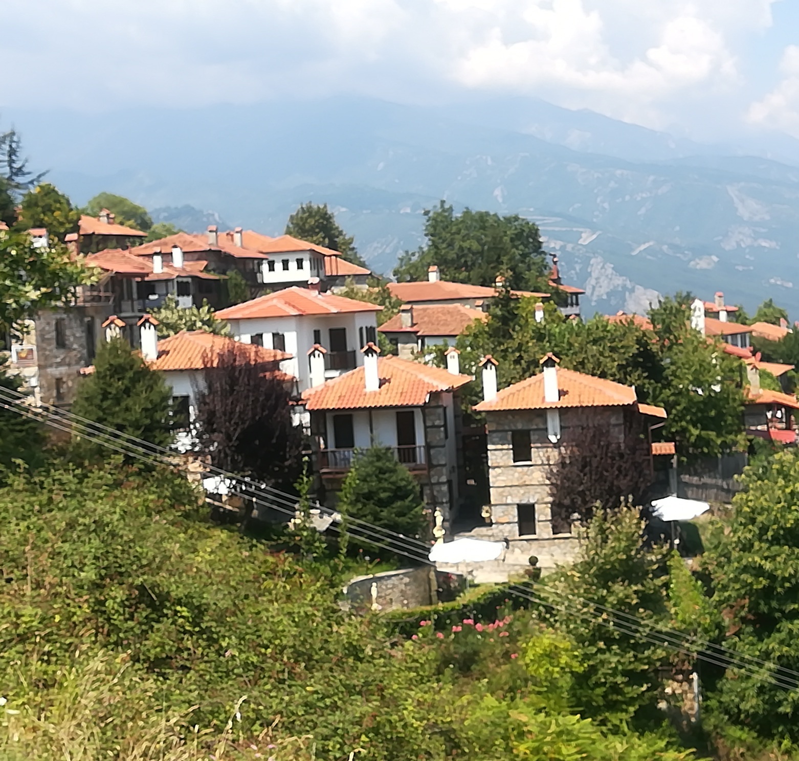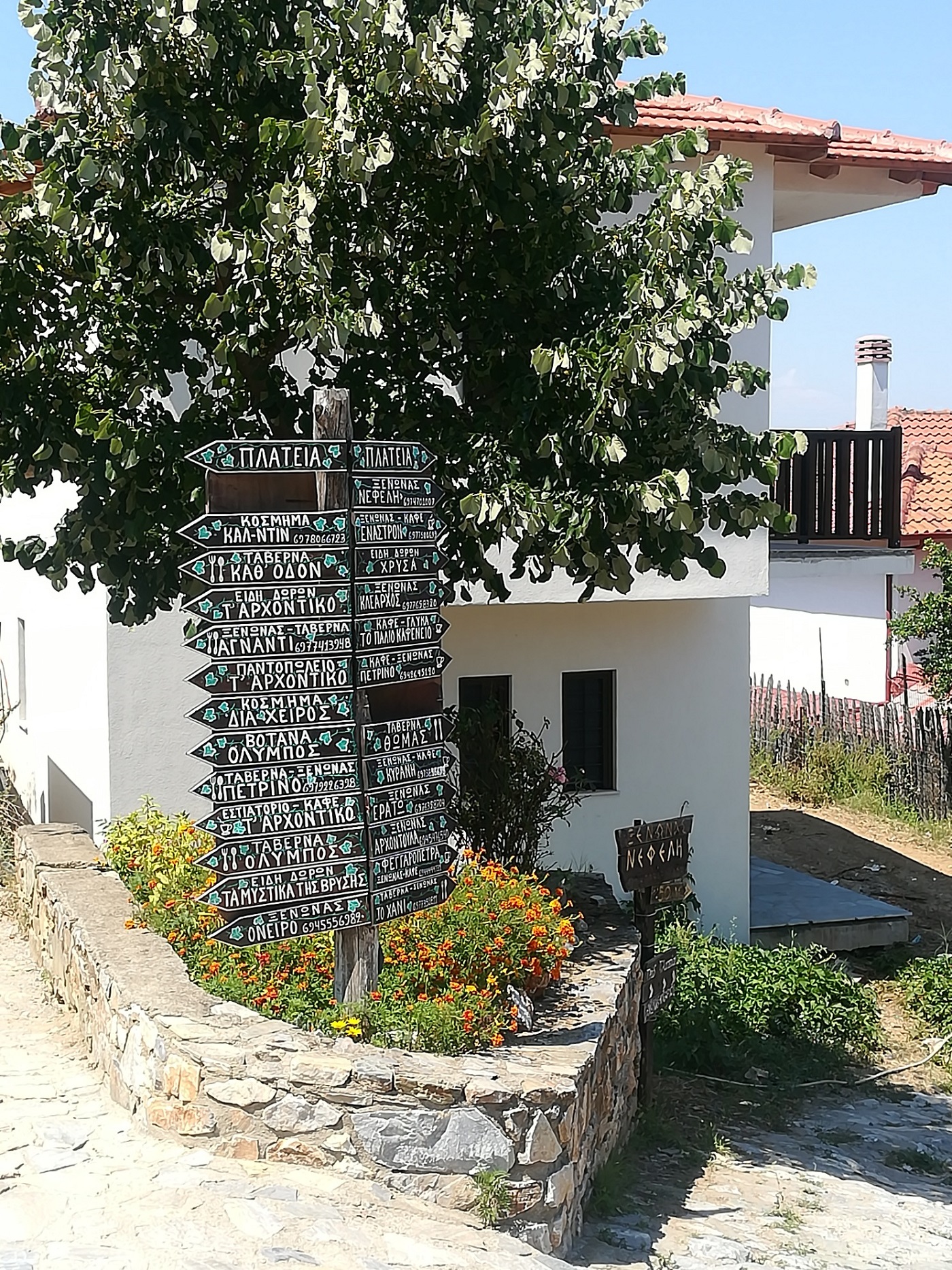 Oprim, coborâm, respirăm şi ne aruncăm privirea dincolo de parapetul de piatră care anunţă intrarea în sat. Într-un abur albastru se văd de sus, golful, marea, lanţul de staţiuni de pe riviera Olimpului, cetatea Platamonas. Iar în apropiere, muntele, pădurea şi nişte acoperişuri din ţiglă roşie, etajate, terasate, precum nişte umbrele cu o geometrie perfectă, încadrate de multă verdeaţă. Dăm de prima intersecţie pavată cu piatră, care mă face să mă pregătesc pentru o incursiune într-o poveste; amplasat într-un strat cu crăiţe… panoul cu indicatoarele străzilor, scrise de mână pe plăcuţe din lemn, apoi prima cabină telefonică, apărută unde nu te-aştepţi, agăţată de-un perete de piatră, protejată de un acoperiş cu ţiglă cu muşchi şi licheni, şi-apoi coborârea spre centru, unde dai de primul magazin, unde lumea se înghesuie să deguste şi să cumpere tsipouro – băutura făcută de localnici, un fel de ţuică tare şi aromată.