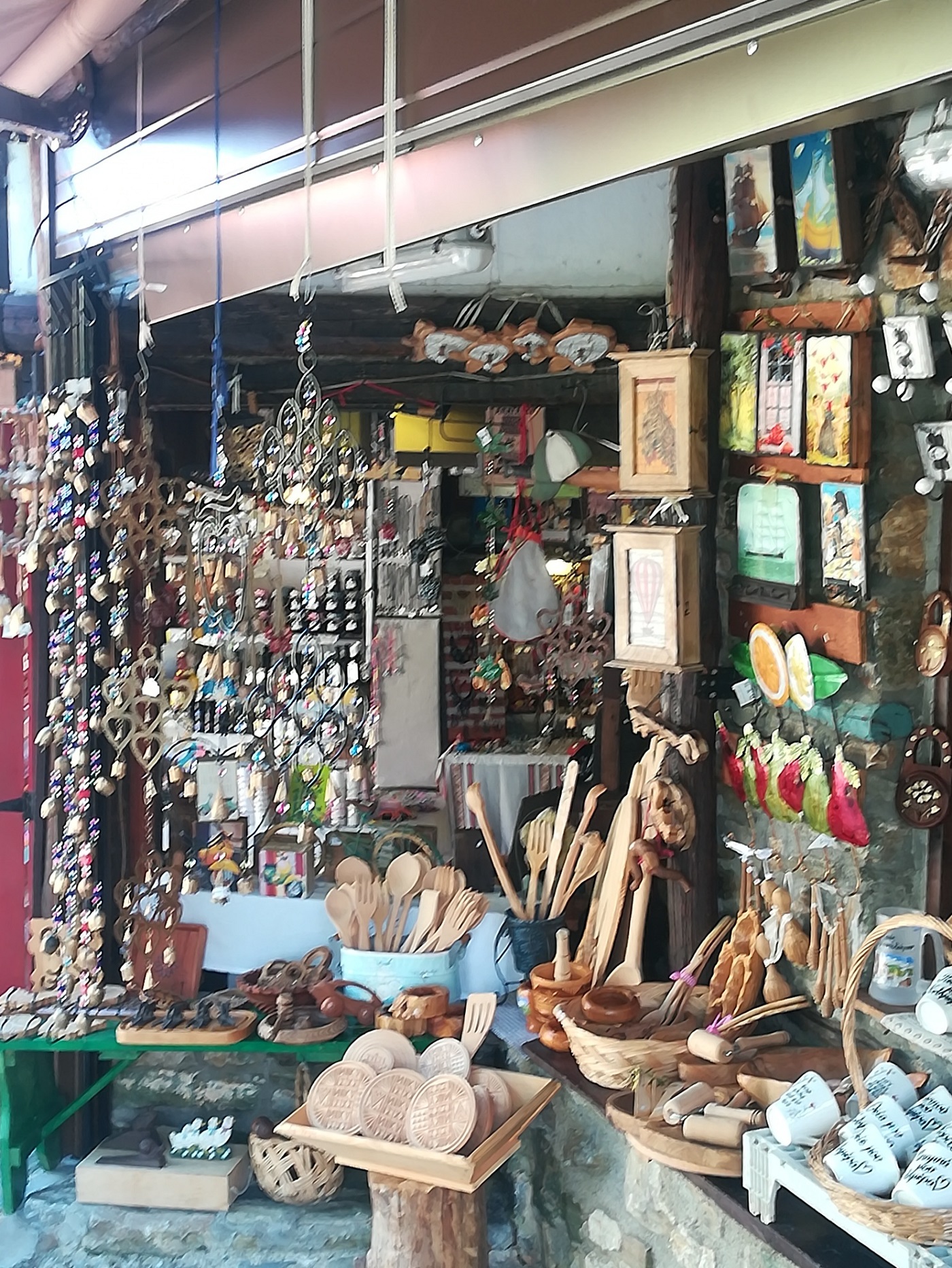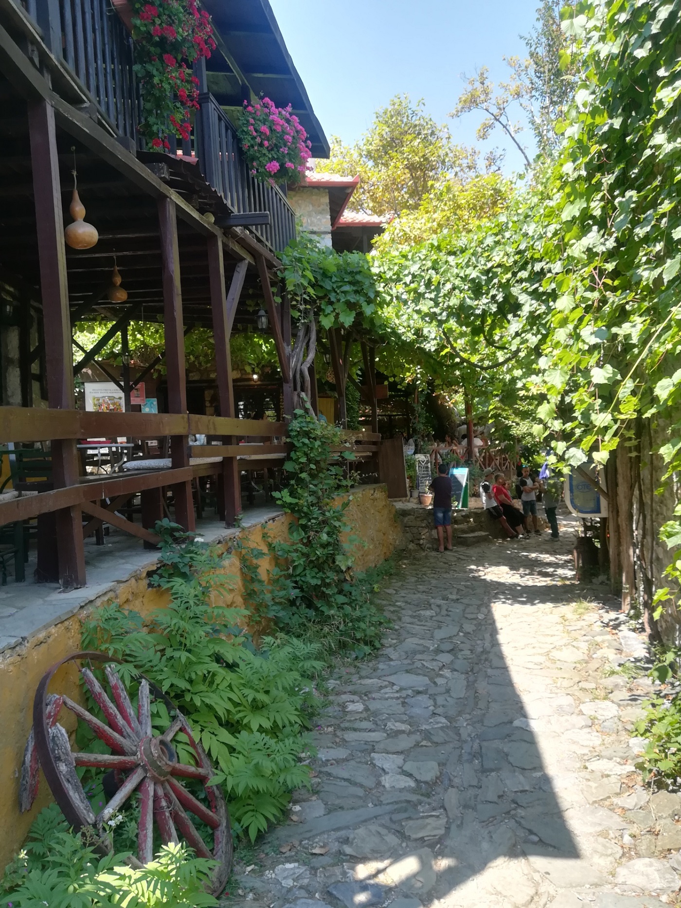 Casele din piatră şi lemn par că pornesc una din alta, doar cu mici pauze de flori între ele. Totul e din piatră, totul pare lucrat manual: de la străzi şi indicatoare, la meniurile majorităţii tavernelor unde se mănâncă tradiţional şi bine. Magazinele sunt mai degrabă nişte cămări de gospodine, cu şerveţele brodate şi mileuri din dantelă manuală, puse sub borcanele de miere de castan, şerbeturi, dulceţuri şi băuturi. Valurile de turişti care năvălesc pe străduţele mici-mici, boltite de viţă de vie, iederă, pipa turcului, rodie şi rododendron mă trimit cu gândul la laptele care dă-n clocot. Atât de mulţi sunt.