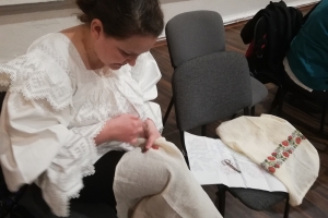 O apariţie discretă, aproape timidă, o femeie care se vedea că e pentru prima oară în grupul în care lucrătoarele încep deja să se cunoască între ele, se aşează pe un scaun şi se apucă de lucru. Atrage repede atenţia tuturor pentru că poartă o ie de Maramureş cu o broderie ireală şi coase un model cu flori pe pânză de in, care pare mai degrabă pictat decât lucrat. De loc din Călineşti, Cristina Ţânţaş e învăţătoare în Seini şi a aflat de şezătoarea de la muzeu de pe reţelele de socializare. „M-am interesat ce trebuie să fac, dacă nu trebuie să mă înscriu pe vreo listă ca să pot să vin.” Vorbeşte cu o emoţie care-i umezeşte ochii despre pasiunea ei pentru lucru de mână, despre ia pe care o poartă, care a fost cămaşa ei de mireasă, la care a lucrat un an şi jumătate împreună cu mama ei, despre orele în care le vorbeşte elevilor săi despre obiceiuri şi tradiţii, în care îi învaţă să coase sau să scarmene lână. Ştie că, în familia ei, tradiţia cusutului şi a brodatului va fi dusă mai departe de fetiţa ei, aşa cum şi ea a preluat-o de la mama sa. „Peste două săptămâni, o să-i duc pe elevii mei «pe potecile sufletului» la Călineşti. O să facem acolo o şezătoare la mine acasă”.