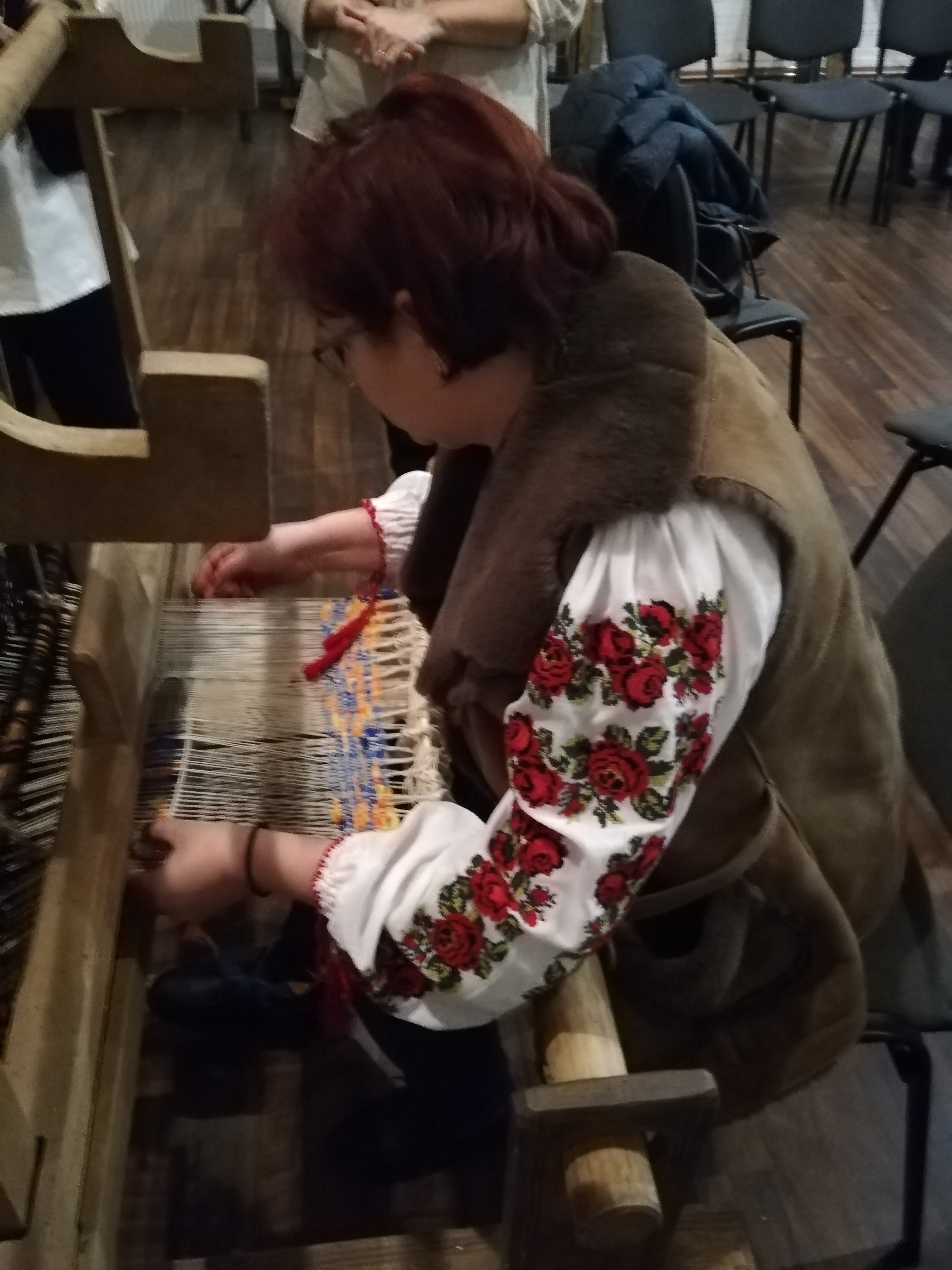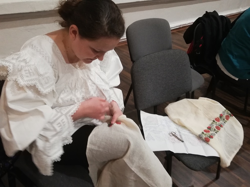 O apariţie discretă, aproape timidă, o femeie care se vedea că e pentru prima oară în grupul în care lucrătoarele încep deja să se cunoască între ele, se aşează pe un scaun şi se apucă de lucru. Atrage repede atenţia tuturor pentru că poartă o ie de Maramureş cu o broderie ireală şi coase un model cu flori pe pânză de in, care pare mai degrabă pictat decât lucrat. De loc din Călineşti, Cristina Ţânţaş e învăţătoare în Seini şi a aflat de şezătoarea de la muzeu de pe reţelele de socializare. „M-am interesat ce trebuie să fac, dacă nu trebuie să mă înscriu pe vreo listă ca să pot să vin.” Vorbeşte cu o emoţie care-i umezeşte ochii despre pasiunea ei pentru lucru de mână, despre ia pe care o poartă, care a fost cămaşa ei de mireasă, la care a lucrat un an şi jumătate împreună cu mama ei, despre orele în care le vorbeşte elevilor săi despre obiceiuri şi tradiţii, în care îi învaţă să coase sau să scarmene lână. Ştie că, în familia ei, tradiţia cusutului şi a brodatului va fi dusă mai departe de fetiţa ei, aşa cum şi ea a preluat-o de la mama sa. „Peste două săptămâni, o să-i duc pe elevii mei «pe potecile sufletului» la Călineşti. O să facem acolo o şezătoare la mine acasă”.