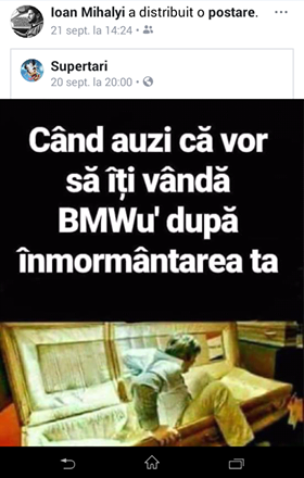 Am mai scris despre cazul borșeanului Ioan Mihalyi (33 de ani). Reamintim un fragment. Veți vedea și de ce. ” În 1 octombrie (la 11.57), pe pagina sa de socializare, borșeanul Ioan Mihalyi și-a schimbat poza de profil cu una alb-negru, evident mai artistică. Poate că la această opțiune a contribuit și faptul că mașina sa – un BMW 320 –, la care ținea mult, era tot alb-negru; de fapt albă, negre fiind grila, chederele și jantele, singura pată de culoare fiind albastrul din sigla mărcii germane”. La o săptămână după aceea, Ion Mihalyi a murit într-un accident de mașină în Argelato (Italia), pe când își conducea BMW-ul. Dacă poate fi considerată o simplă speculație chestiunea cu poza alb – negru, o altă observație interesantă ne-a transmis-o Loredana D. Adriana, vecină și prietenă pe facebook cu borșeanul. Cu 10 zile înainte de a-și schimba poza de profil, în 21 septembrie, Ioan Mihalyi distribuia pe pagina sa de socializare o postare specifică unui fan BMW: Ce se întâmplă ”când auzi că vor să-ți vândă BMW-ul după înmormântarea ta”. Te scoli din morți – sugerează postarea. Dacă la acel moment postarea părea benignă și chiar simpatică, după toate cele petrecute, parcă ești tentat să-i atribui și nuanțe premonitorii. Oricum, o faci în mod inutil, căci nimic nu mai poate fi schimbat. Cel mult, în gând îți spui: ”Dumnezeu să-l odihnească în pace pe Ioan Mihalyi”.