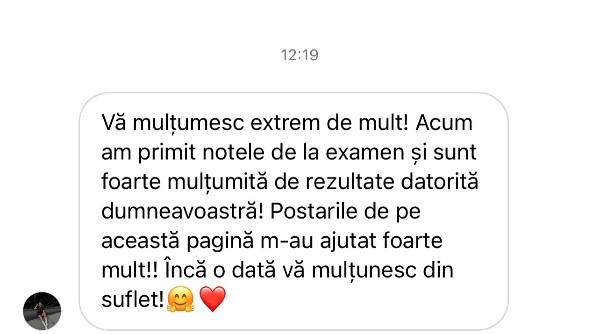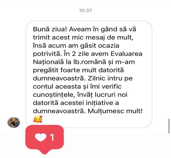Lista proiectelor este deschisă cu informațiile și suportul pe care le-am oferit elevilor claselor a VIII-a și care a implicat o recapitulare amănunțită a materiei pentru Evaluarea Națională. Așadar, timp de două luni și jumătate (aprilie, mai și până la susținerea examenului) am dat start maratonului ,,Învățăm împreună pentru Evaluarea Națională” pe pagina oficială de Instagram (@vorbestecorectgramatical) și, astfel, i-am atras pe absolvenții claselor a VIII-a cu teste și lecții bine pregătite, explicate pe înțelesul tuturor. Încă de la începutul acestui maraton, am spus că, dacă voi primi un singur mesaj de mulțumire, înseamnă că mi-am atins scopul. Bineînțeles, nu a fost un singur mesaj, ci zeci de mesaje, unele primite chiar după susținerea examenului și altele după aflarea rezultatelor! Tot ce pot să afirm este că acest maraton a fost un real succes! Nu au mai contat orele muncite pentru pregătirea materialelor și a testelor, copiii (și nu numai) au fost foarte mulțumiți. Mi-aș putea dori o altă răsplată? Nu, categoric nu! ,,Mulțumesc”, aceasta este adevărata răsplată!