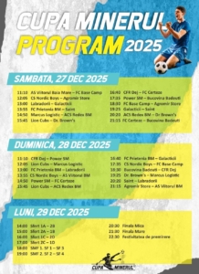 Se dă startul, astăzi, unei noi ediții a Cupei Minerul de fotbal în sală. Competiția, care se va desfășura în Sala polivalentă „Lascăr Pană”, reunește la start 16 echipe, împărțite în patru grupe. Componența grupelor este următoarea: