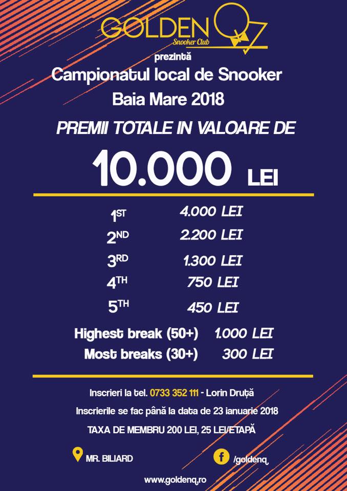 23 de mânuitori ai tacului de snooker au început de aseară o competiție cu caracter local, sub denumirea Golden Q. Competiția va avea 10 etape, eșalonate de-a lungul unui an, iar la final se vor acorda premii în valoare totală de 10.000 lei. Printre cei 23 se numără jucători amatori din Baia Mare, dar și participanți din orașe precum Cuj Napoca ori Sibiu. Golden Q a debutat în seara de 25 ianuarie la clubul Mr. Biliard, cu prima etapă a sezonului 2018 și promite să fie una din cele mai puternice campionate locale de snooker din țară, așa cum ne-a declarat Lorin Druță, organizatorul principal al concursului și, totodată, campionul en-titre. Cât despre nivelul calitativ al participanților trebuie menționat că în ediția de anul trecut s-au realizat peste 50 de break-uri de peste 30 de puncte, cel mai mare fiind de 97, realizat de Lorin Druță, care are în palmares și un break maxim de 147 puncte.