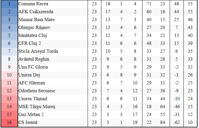 O eventuală victorie a maramureșenilor ar fi fost aproape decisivă în vederea promovării echipei lui Romulus Buia în Liga a 2-a. Nu a fost să fie, oaspeții venind la Recea cu gândul clar de a răzbuna înfrângerea cu 0-3 din tur. De altfel, ei au aranjat ca meciul să fie transmis pe internet. S-a trecut rapid peste perioada de tatonare, ciucanii marcând în minutul 7 prin căpitanul Barna Bajko, care a primit o minge pe culoarul central, a pătruns și a șutat plasat în dreapta lui Bota de la 14 metri (0-1). Minutul 31 aduce o fază ciudată în fața careului gazdelor. Milian Urs pasează inexplicabil unui adversar, acesta profită, încearcă să pătrundă, însă Urs, frustrat, comite un fault în poziție de ultim apărător. Cartonaș roșu clar și Recea rămâne în 10 oameni. La faza imediat următoare ciucanii execută o lovitură de colț, iar Slobodan Lalic trimite mingea în poartă de la 7 metri (0-2). Până la pauză mai consemnăm uriașa ratare a lui Mărieș, care a pătruns talonat până în apropierea colțului din stânga al careului mi,c de unde a trimis un lob peste portar. Mingea a căzut însă pe bara transversală.