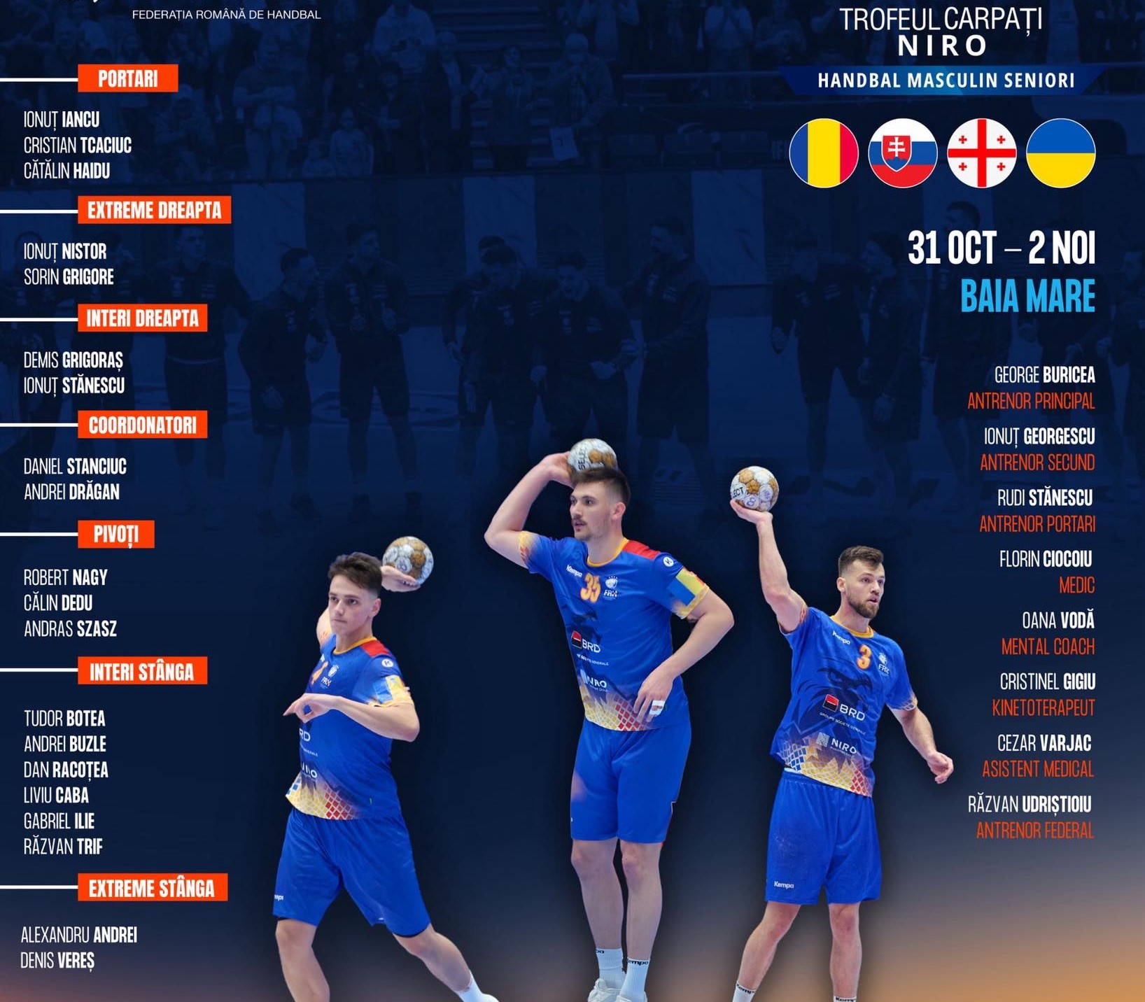 Federația Română de Handbal a anunțat astăzi lotul de jucători convocat de selecționerul George Buricea pentru acțiunea de pregătire centralizată și pentru Trofeul Carpați, din perioada 25 octombrie – 3 noiembrie.