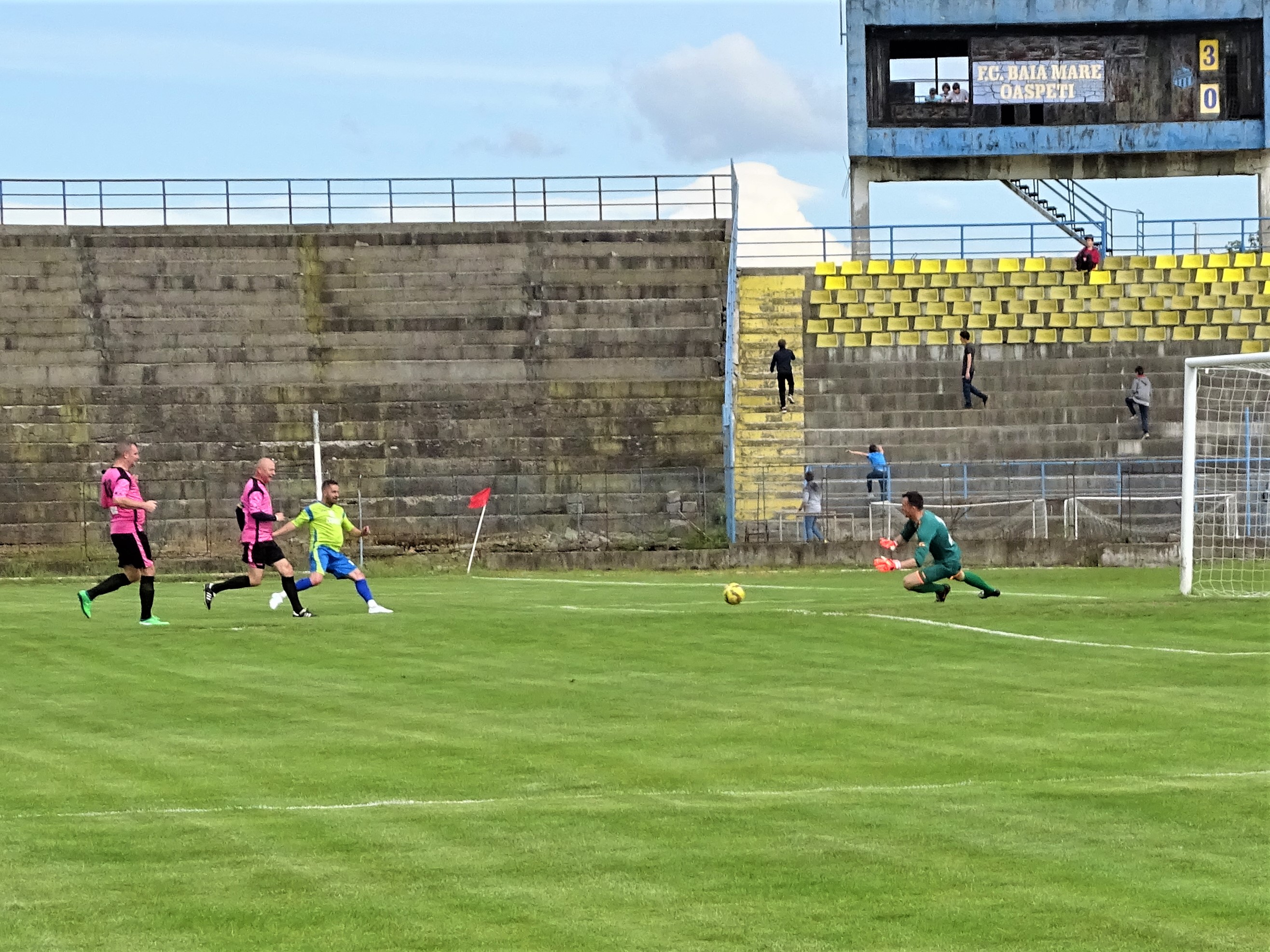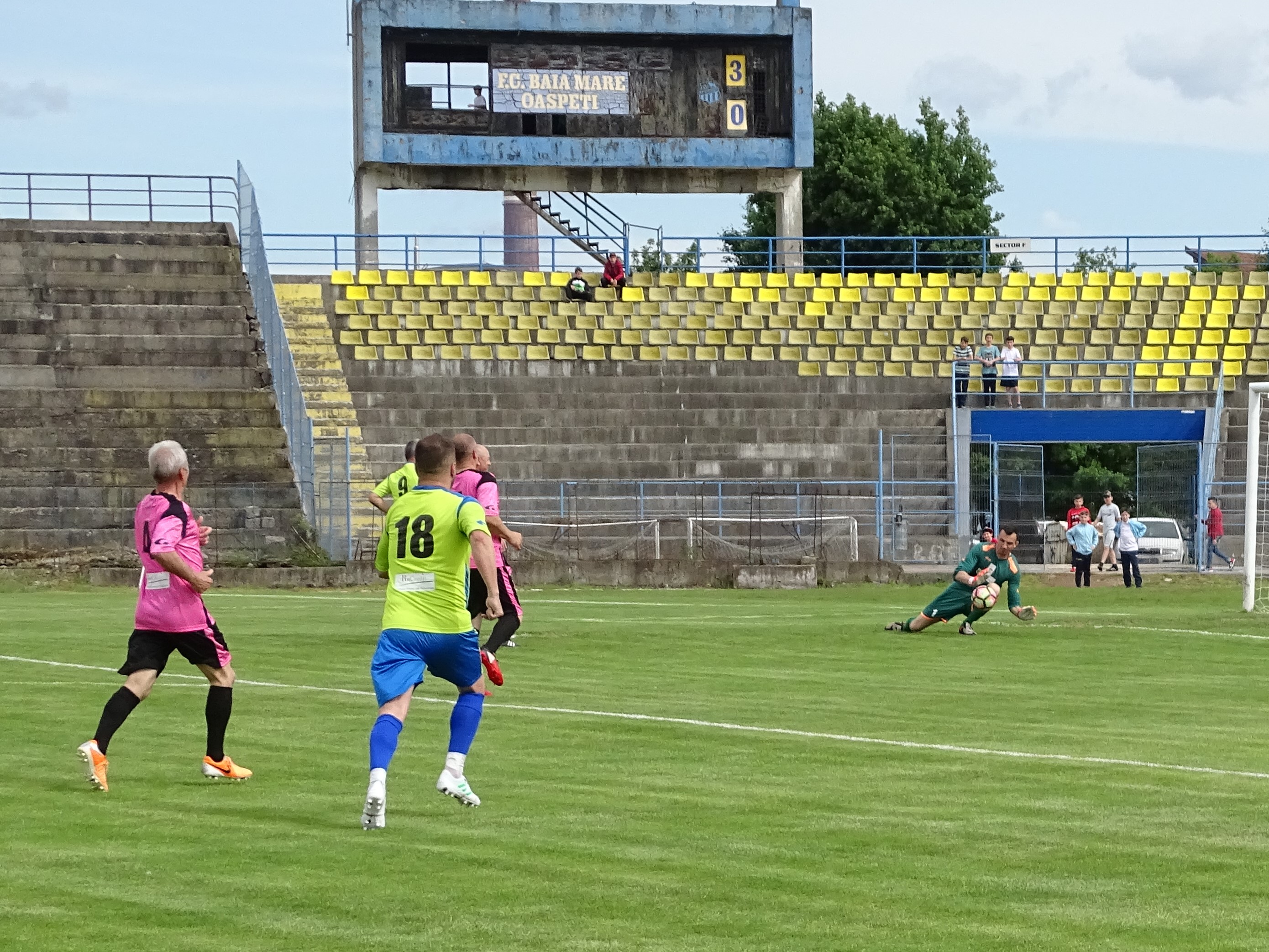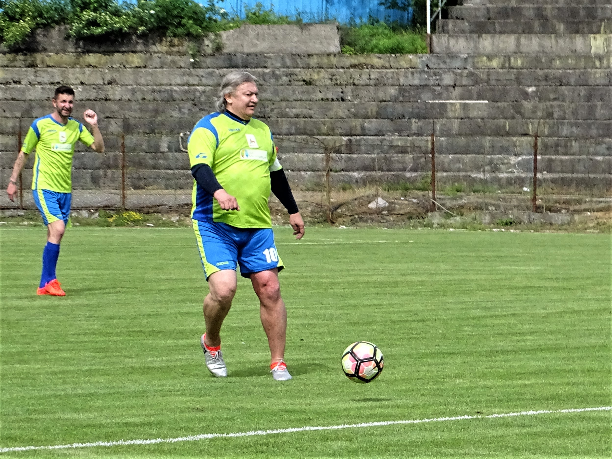 Prima parte a meciului s-a jucat comasat în zona centrală a terenului, puțini fiind cei dispuși să sprinteze spre poarta adversă. Maramureșenii au dominat totuși și au și deschis scorul, Dănuț Sabou executându-l pe Florin Prunea cu un lob care în zilele de glorie nu i-ar fi pus probleme (foto sus). A venit apoi reușita ”arabului” Ciprian Danciu, înaintea pauzei de hidratare (numai cu apă). Apoi Petrică Negrea a marcat golul de 3-0, scor consemnat la pauză. Pe culoarele dinspre vestiare arbitrul Zoltan Szekely junior a promis că lucrurile nu vor rămâne așa, având el grijă să vadă un penalty în favoarea Legendelor. Zis și făcut. La scurt timp după reluare, oaspeții au ajuns în careul advers și drept pedeapsă că nu au fost lăsați să marcheze au primit cadou o lovitură de la 11 metri. A executat eternul Dănuț Lupu, care, de altfel, datorită formei fizice (la propriu) de invidiat, a fost printre singurii fotbaliști cu „greutate” care au dus meciul până la capăt. La 3-1 Legendele au prins aripi și au redus din handicap prin Rică Neaga, care a driblat tot ce a avut în față (e drept, destul de puțin), l-a culcat și pe Bota și a intrat cu tot cu minge în poartă. Tot el a făcut și faza golului egalizator, când a demonstrat că a învățat ce înseamnă altruism și i-a pasat lui Iulian Mihăilă, care a marcat nestingherit.