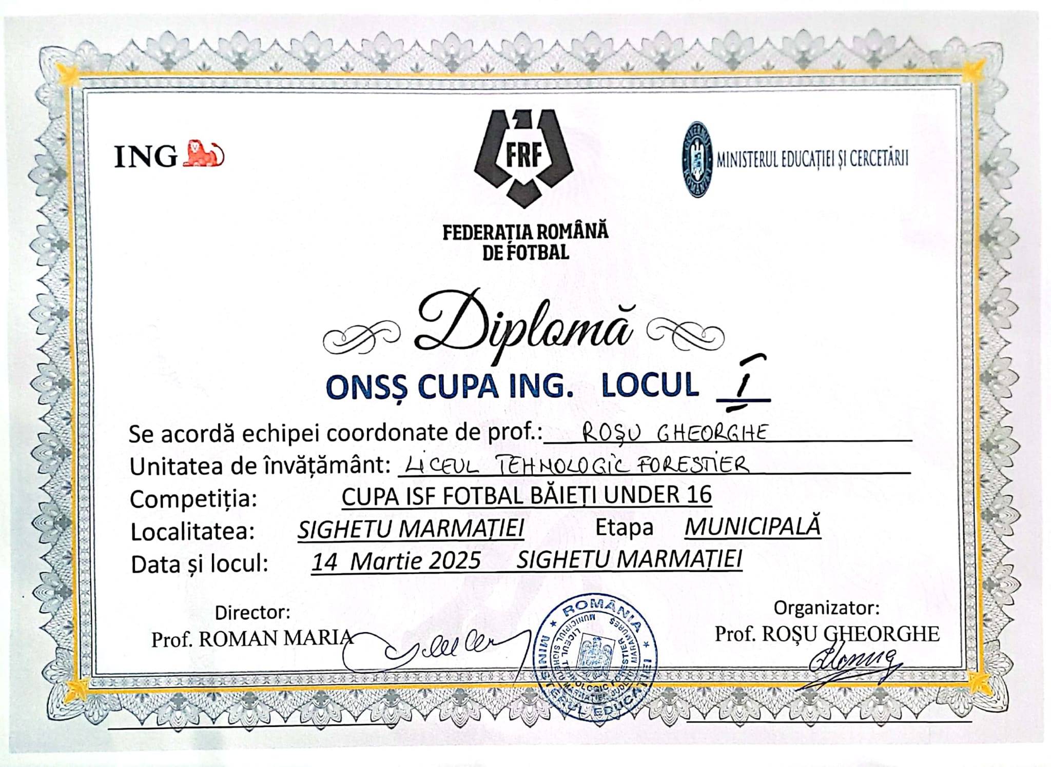 Echipa de fotbal a Liceului Tehnologic Forestier din Sighetu Marmației a obținut locul I la competiția Cupa ISF Fotbal Băieți Under 16, etapa municipală, desfășurată pe 14 martie 2025. Evenimentul a avut loc în Sighetu Marmației și a reunit echipe de la mai multe unități de învățământ din oraș, oferind o competiție intensă și plină de fair-play.