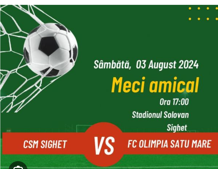 Sâmbătă, 3 august, de la ora 17.00, pe Stadionul Solovan, echipa CSM Sighetu Marmației va juca un meci amical cu FC Olimpia Satu Mare. Un astfel de meci îi va ajuta pe sportivii sigheteni să se mențină în formă și să experimenteze diverse tactici, fără presiunea unui rezultat oficial. Obiectivul sighetenilor pentru sezonul următor, este de a se califica în play-off.