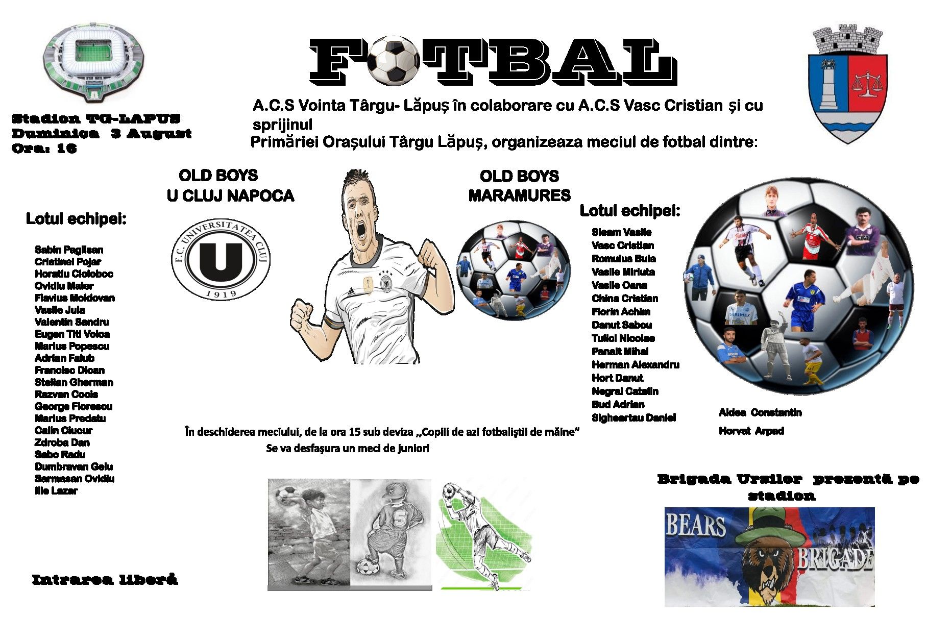 ACS Voința Târgu Lăpuș, în colaborare cu ACS Vasc Cristian, organizează duminică, 3 august, de la ora 16:00, meciul de old boys Maramureș – „U” Cluj. Acesta se va desfășura pe stadionul din Târgu Lăpuș.