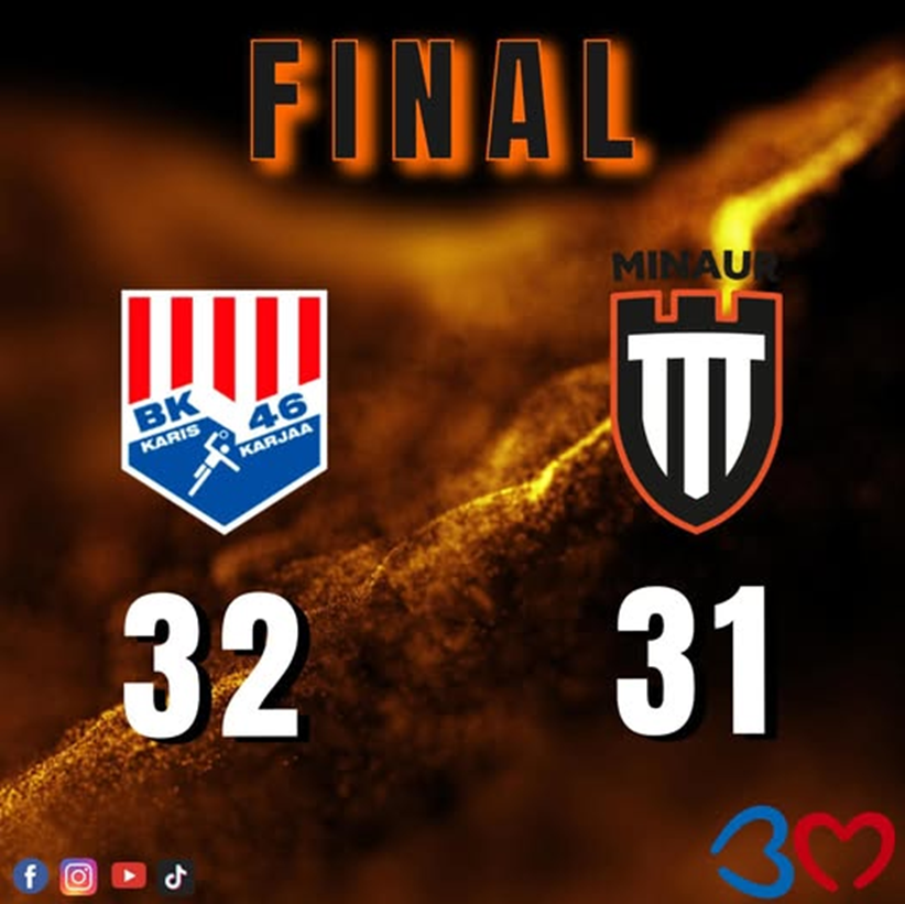În primul meci, desfășurat vineri, 21 februarie 2025, la Karis, Minaur s-a impus cu scorul de 33-30, după ce la pauză era condusă cu 18-14. Principalii marcatori pentru echipa băimăreană au fost Tudor Botea, cu 9 goluri, și Milan Kotrc, cu 7 reușite.
