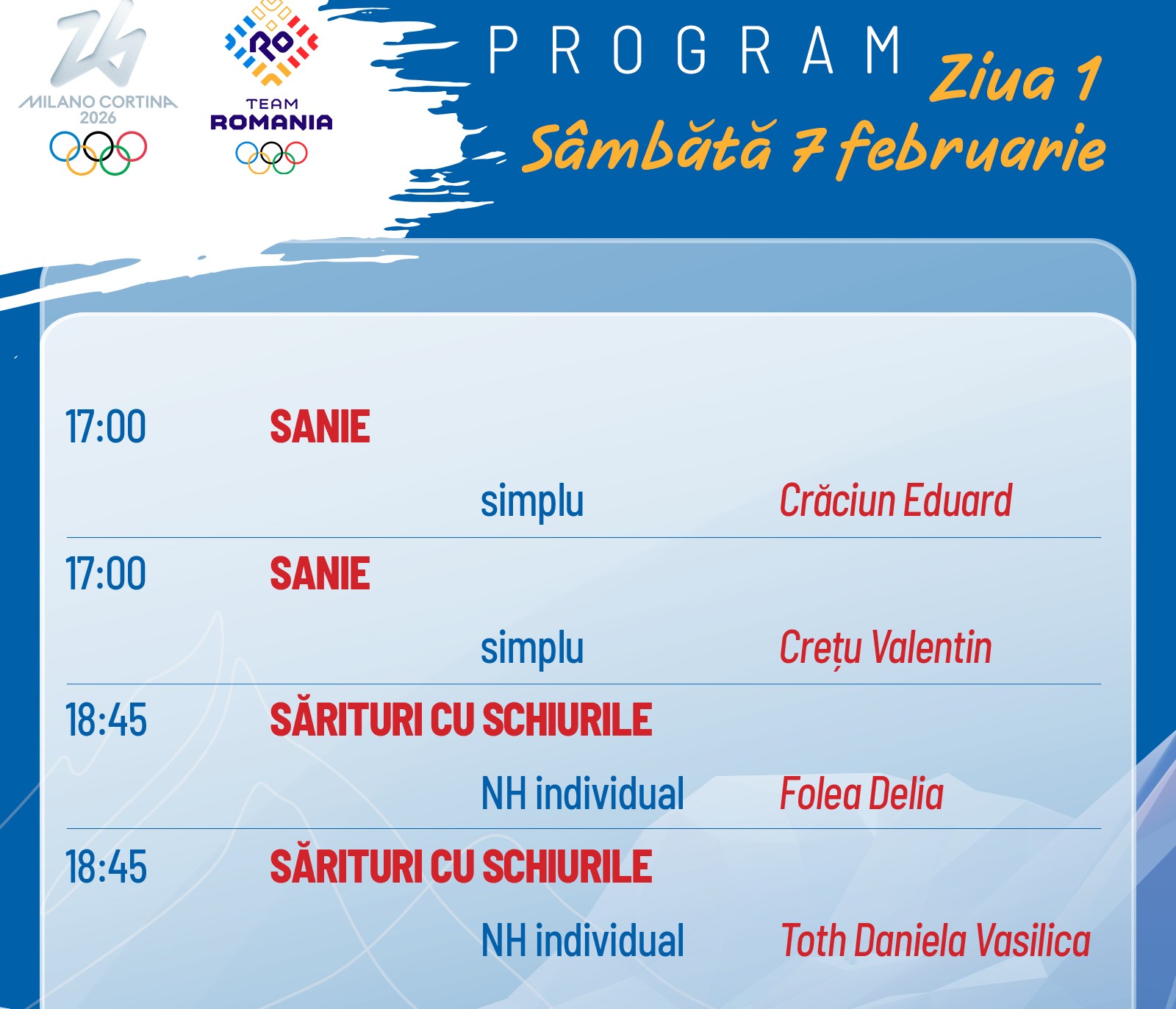 România este reprezentată la cea de-a 14-a ediţie a Jocurilor Olimpice de iarnă de 29 de sportivi, care vor concura la opt discipline: biatlon, bob, patinaj artistic, sanie, sărituri cu schiurile, schi alpin, schi fond și snowboard. Competițiile vor fi transmise de TVR Sport și Eurosport. (T.S.)