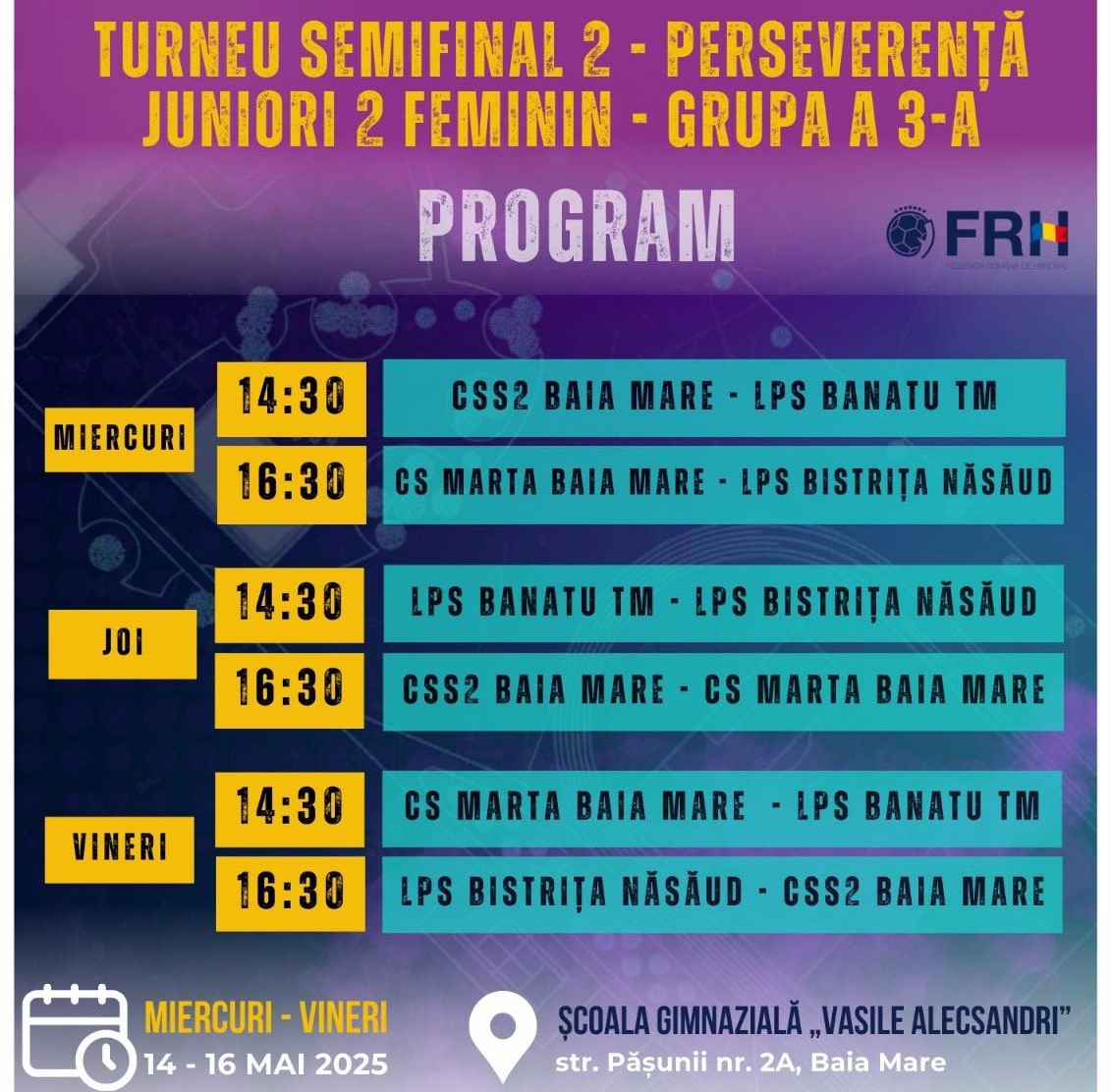 În perioada 14-16 mai, sala de sport a Școlii Gimnaziale „Vasile Alecsandri” din Baia Mare va găzdui turneul semifinal 2 Perseverență din cadrul Campionatului Național de junioare 2, grupa a 3-a. Alături de LPS Bistrița și LPS Banatul Timișoara vor participa două echipe din Baia Mare, CS Marta (foto) și CSS 2.