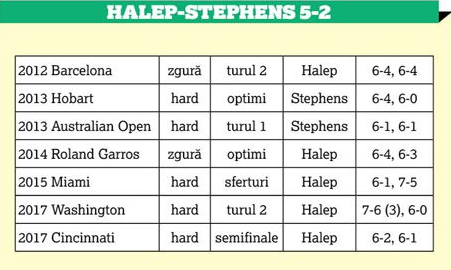 Palmaresul în întâlnirile directe cu Sloane Stephens îi este favorabil: 5-2. În acest sezon,Simona Halep e jucătoarea cu cele mai multe victorii: 34 (pe locul doi, Petra Kvitova – 32), în condițiile în care, ca număr 1 mondial, Simona a început turneele direct din turul 2.