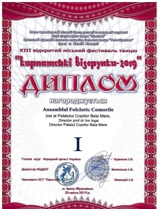 Ansamblul Folcloric “Comorile Izei” al Palatului Copiilor Baia Mare (director prof. dr. Ion Iuga) a obținut locul I la Festivalul Internațional de Folclor “Ornamentele Carpaților”.