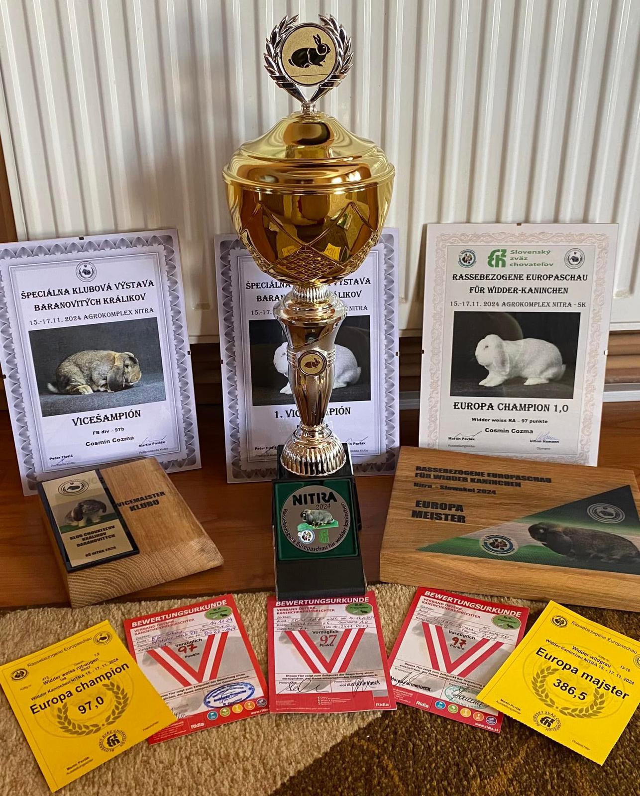 În anul 2025, la Expoziția Europeană de la Nitra, Slovacia, am reușit să depășesc chiar și aceste așteptări, obținând 4 din cele 5 titluri europene, inclusiv titlul de Europa Meister, la rasa pe care o cresc în două varietăți de culoare. Este o performanță rară, care confirmă valoarea genetică excepțională a animalelor mele și nivelul la care a ajuns crescătoria.