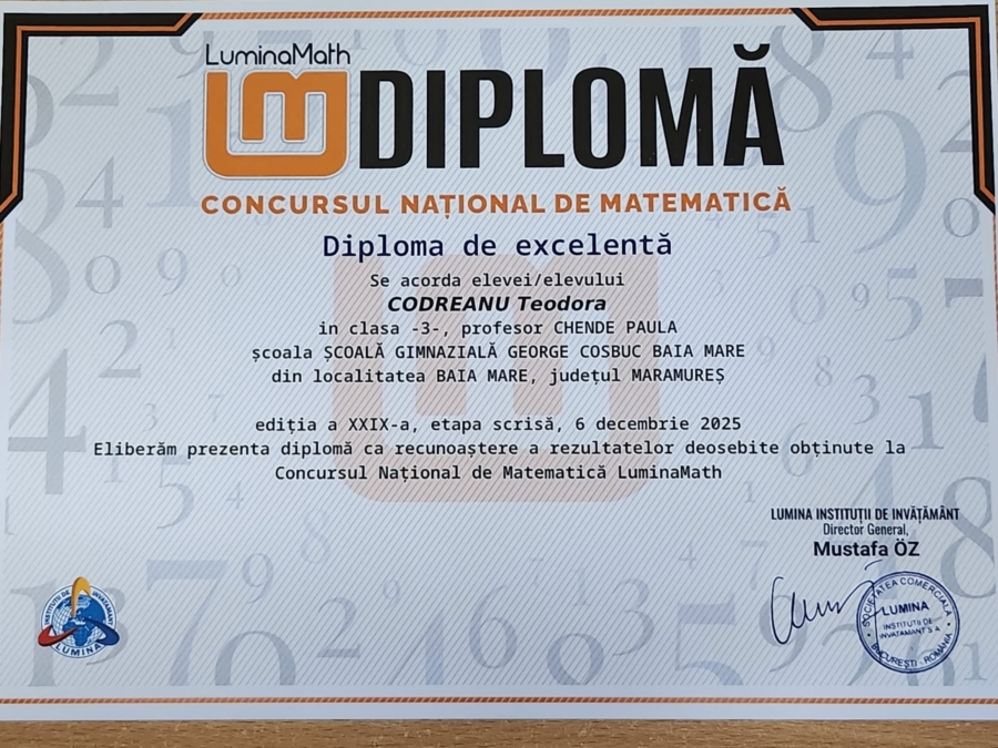 Teodora Codreanu, elevă în clasa a III-a A la Școala Gimnazială „George Coșbuc” din Baia Mare a obținut Premiul de Excelență la nivel județean și a câștigat Tabăra Națională de Matematică, în cadrul prestigiosului concurs de matematică „LuminaMath”.