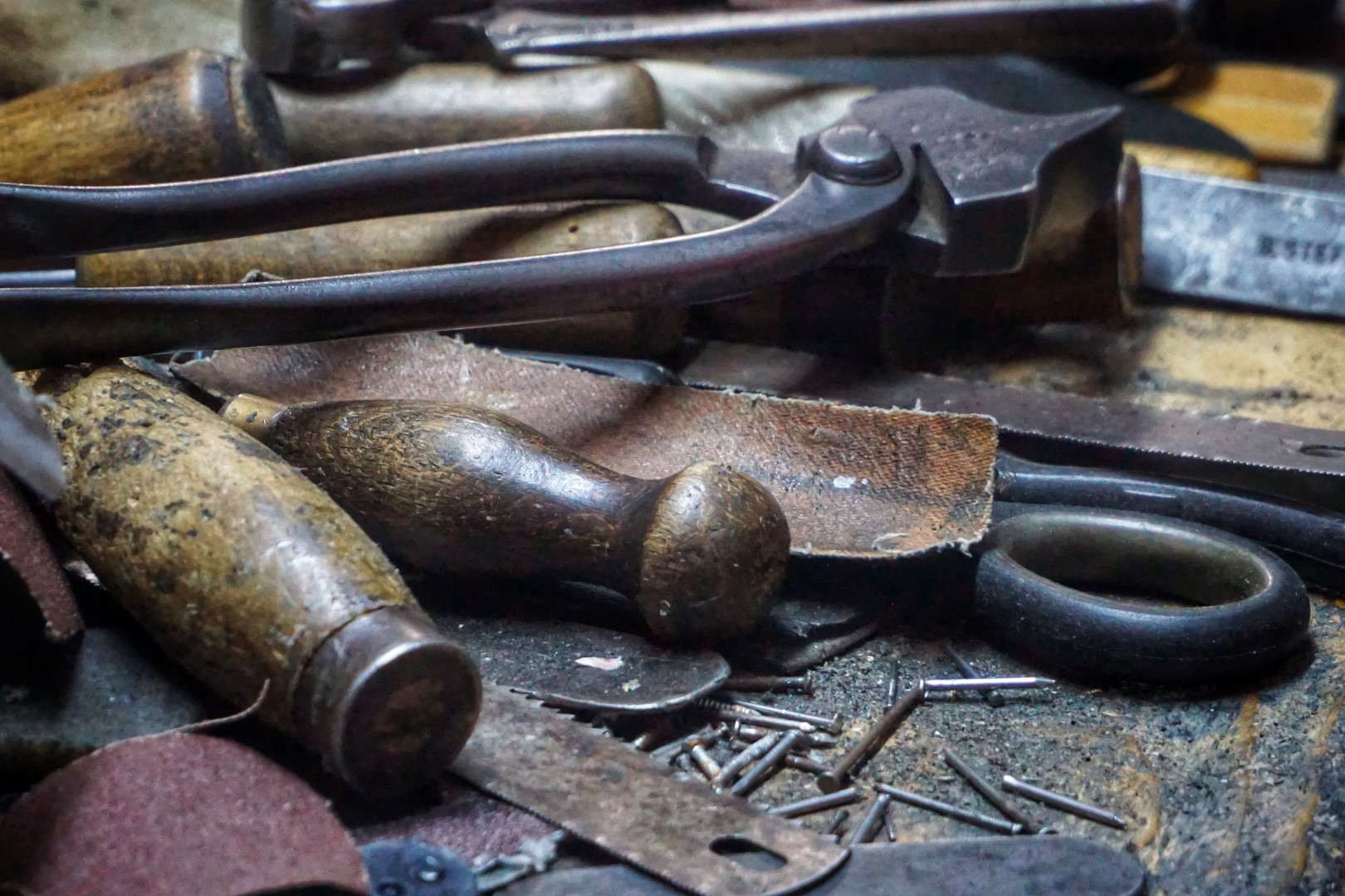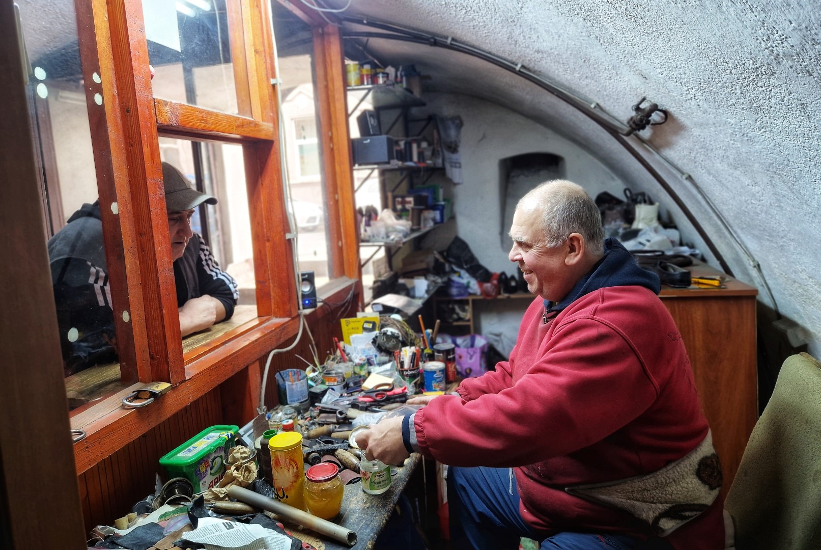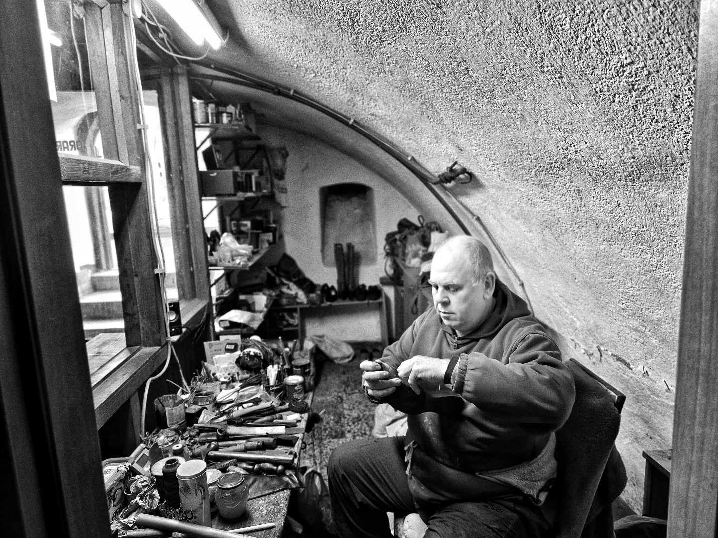 După minerit, am mai lucrat pentru scurtă vreme în tâmplărie termopane, apoi am mers în Spania, la un tunel de cale ferată și într-un final, la începutul lui 2011 mi-am deschis atelierul pe Crișan într-un beci. Pe urmă, în 2018, m-am mutat aici, pe Cloșca. Îmi rămăseseră sculele de când lucrasem la Cooperativa Mogoșa. Părăsisem meseria pentru o vreme, însă pe ele nu le-am abandonat. Sculele mele au o istorie. Știu fiecare de unde o venit, când o venit. Am și sculă veche de 150 de ani. Pot să-ți zic de când am cleștele falț, cuțitul de fasonat, cuțitul de șerfuit, ciocanul de cizmărie, șurubelnița, sula de cusut, rașpilul…