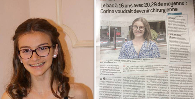 La examenele de bacalaureat din Franța, nota maximă este 20 și se acordă destul de rar. Însă liceanca de origine română, Corina Negulescu, a demonstrat că licența lingvistică „mai maxim” poate fi, câteodată, corectă. Ea obţinut 20,29 de puncte, după ce a susținut două probe suplimentare față de examenul standard. Astfel a devenit, la 16 ani, unul dintre cei 20 de absolvenţi de liceu care reuşeste această performanţă în toată istoria educaţiei din Hexagon, lucru remarcat de presa franceză.